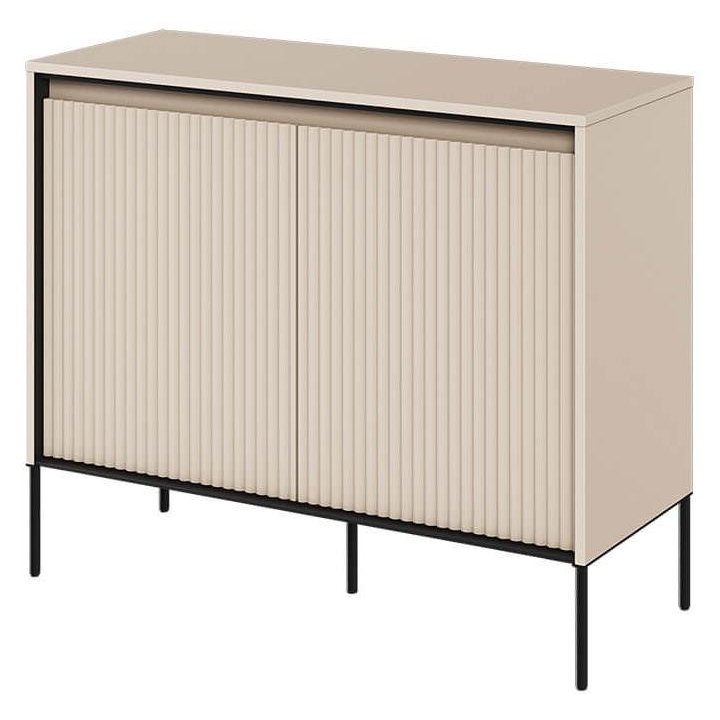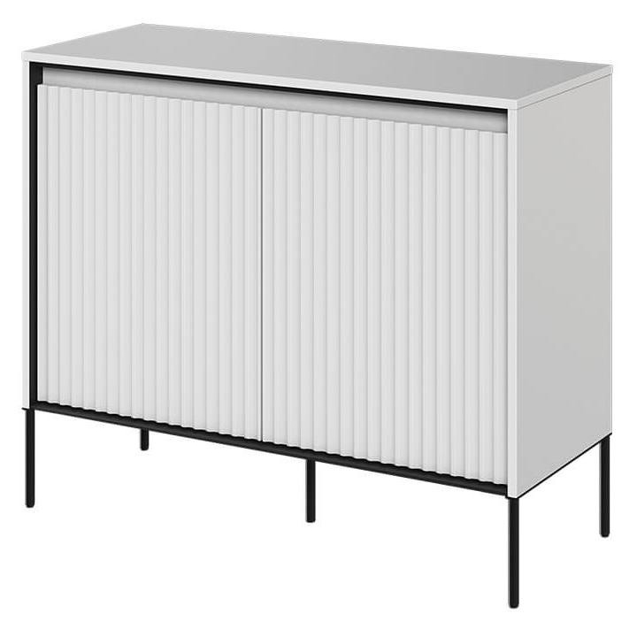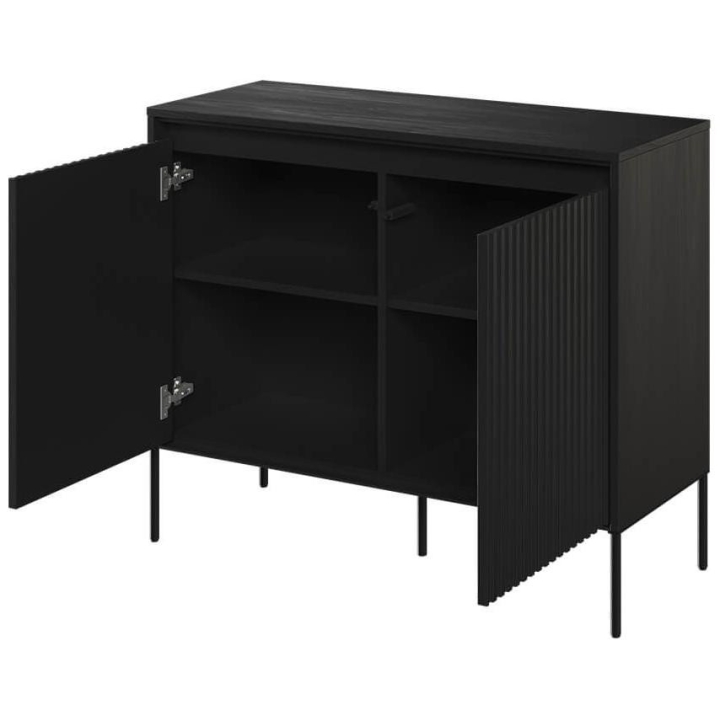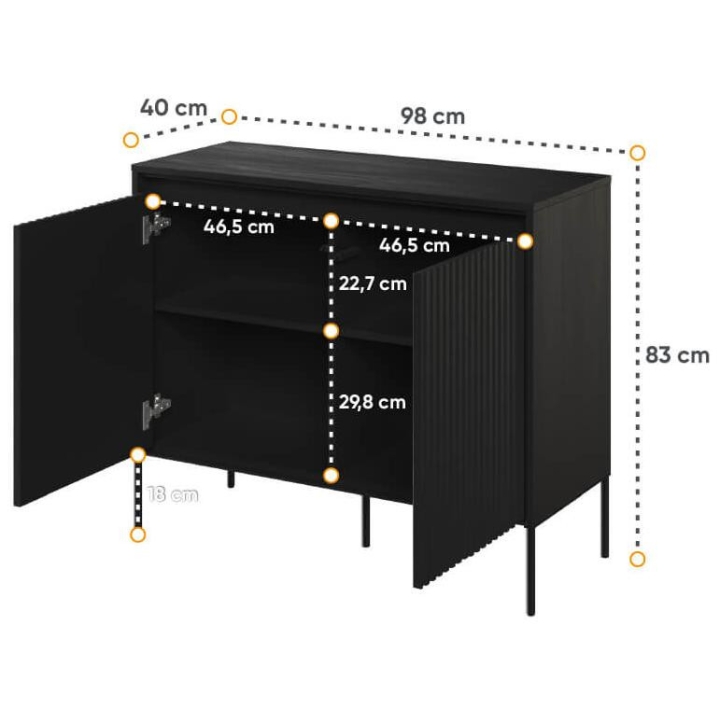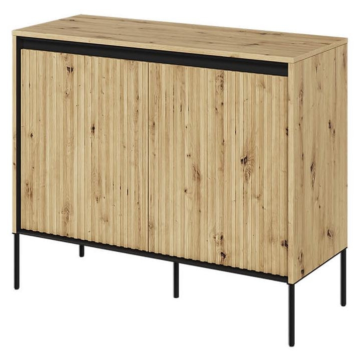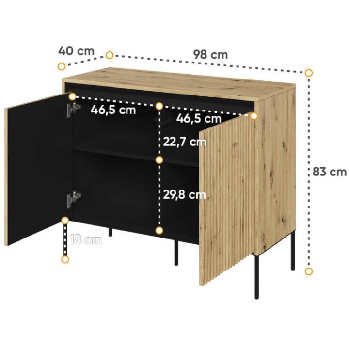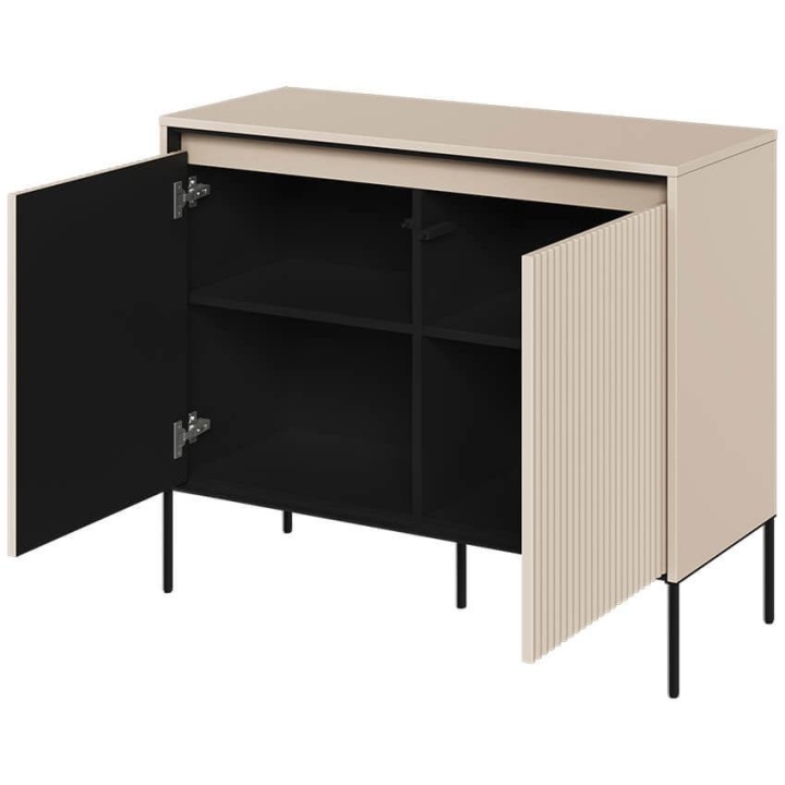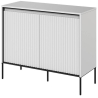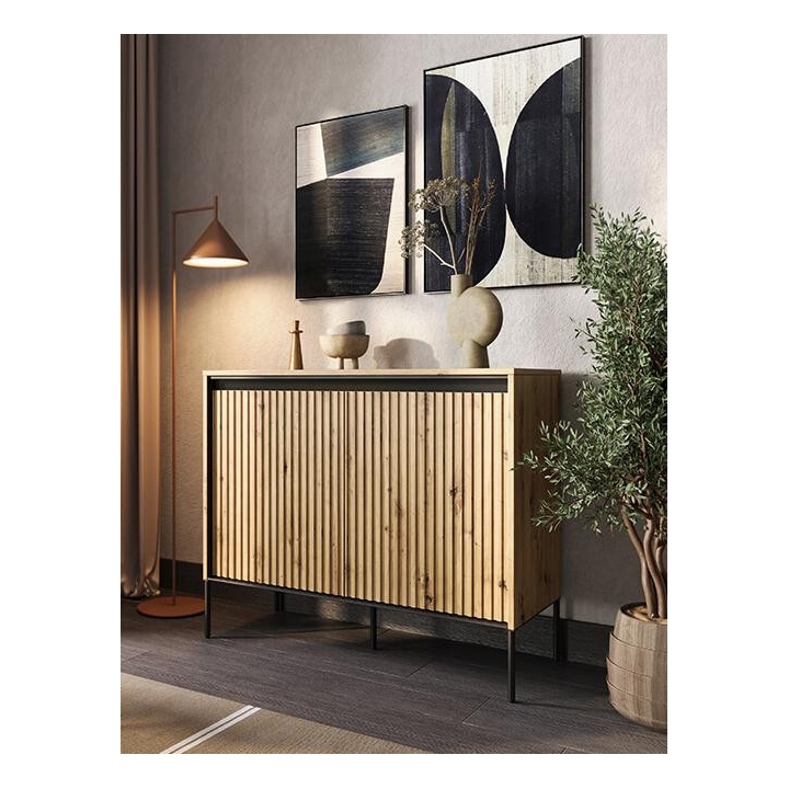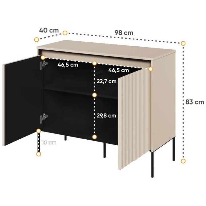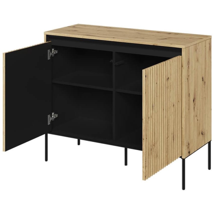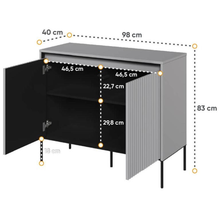 The Trend collection chest of drawers is a timeless piece of furniture made from durable laminated board in five decors - white, sand beige, black, artisan oak and grey. This unique piece of furniture, which has LED lighting included, will fit perfectly into modern and classic interiors. Its dimensions - 98 cm wide, 83 cm high, 40 cm deep - allow for storage of clothes, decorations, bedding and other items, making it extremely practical. The chest of drawers - four doors - is the perfect piece of furniture for displaying your collectables. Assembly requires little effort and the end result is satisfying. The chest of drawers blends perfectly with other pieces from the Trend collection, especially with display cabinets, creating a coherent and functional space. Characteristic elements are the fluted fronts, which add an interesting and unique style to the cabinet. Equipped with a push to open system.