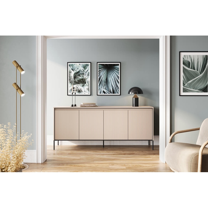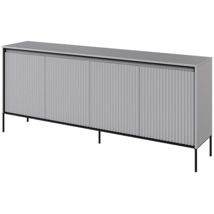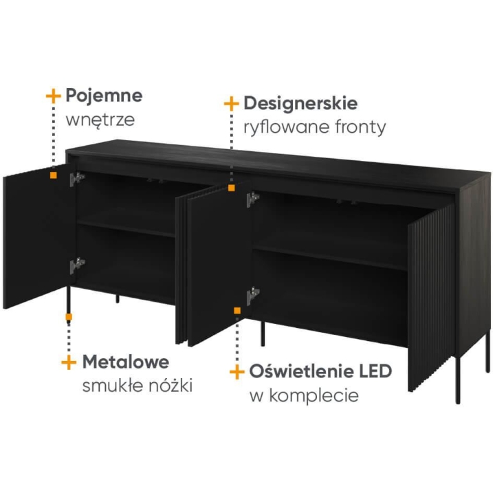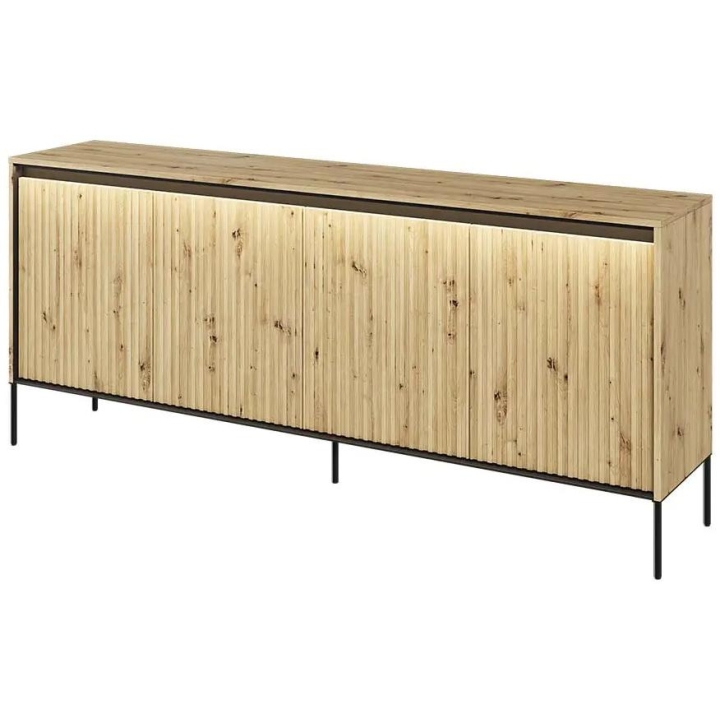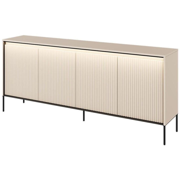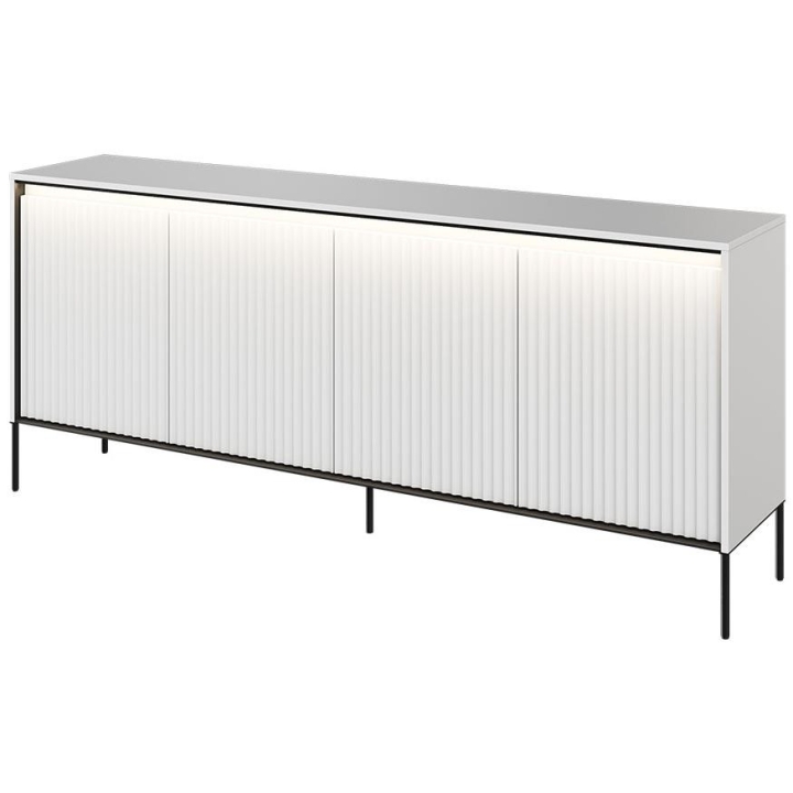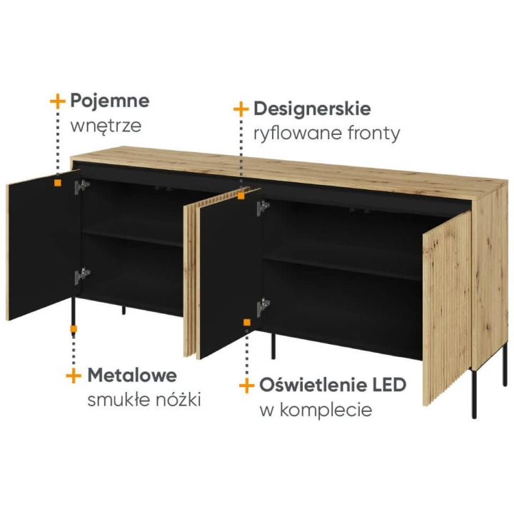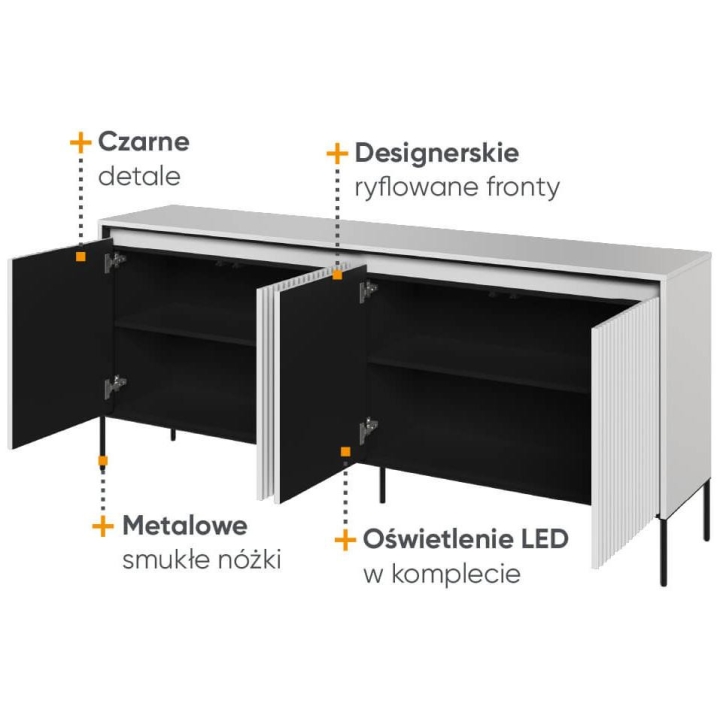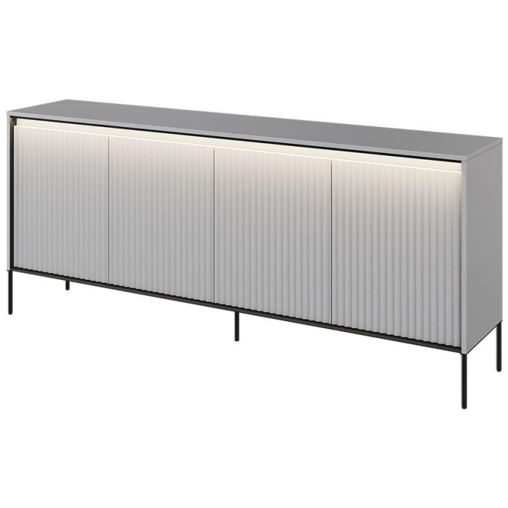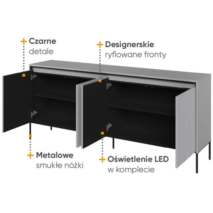 The Trend collection chest of drawers is a timeless piece of furniture made from durable laminated board in five decors - white, sand beige, black, artisan oak and grey. This unique piece of furniture, which has LED lighting included, will fit perfectly into modern and classic interiors. Its dimensions - 193 cm wide, 83 cm high, 40 cm deep - allow for storage of books, decorations, bedding and other items, making it extremely practical. The chest of drawers - four doors - is the perfect piece of furniture for displaying your collectables. Assembly requires little effort and the end result is satisfying. The chest of drawers blends perfectly with other pieces from the Trend collection, especially with display cabinets, creating a coherent and functional space. Characteristic elements are the fluted fronts, which add an interesting and unique style to the cabinet. Equipped with a push to open system.