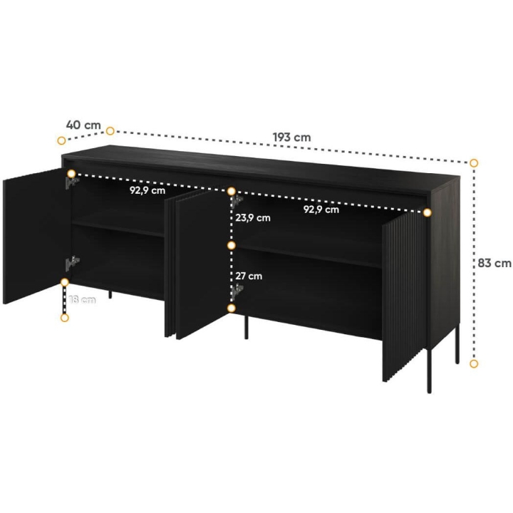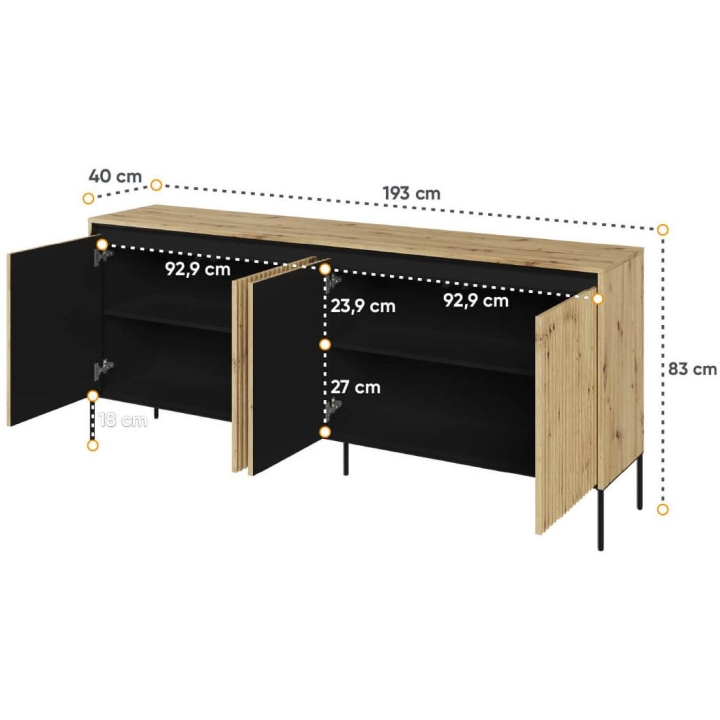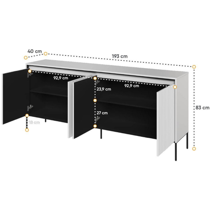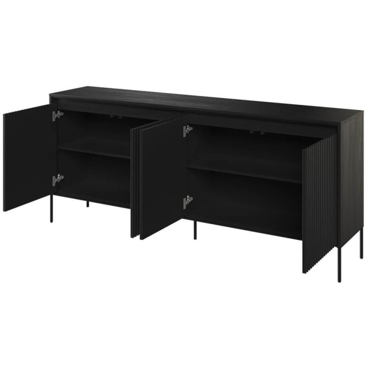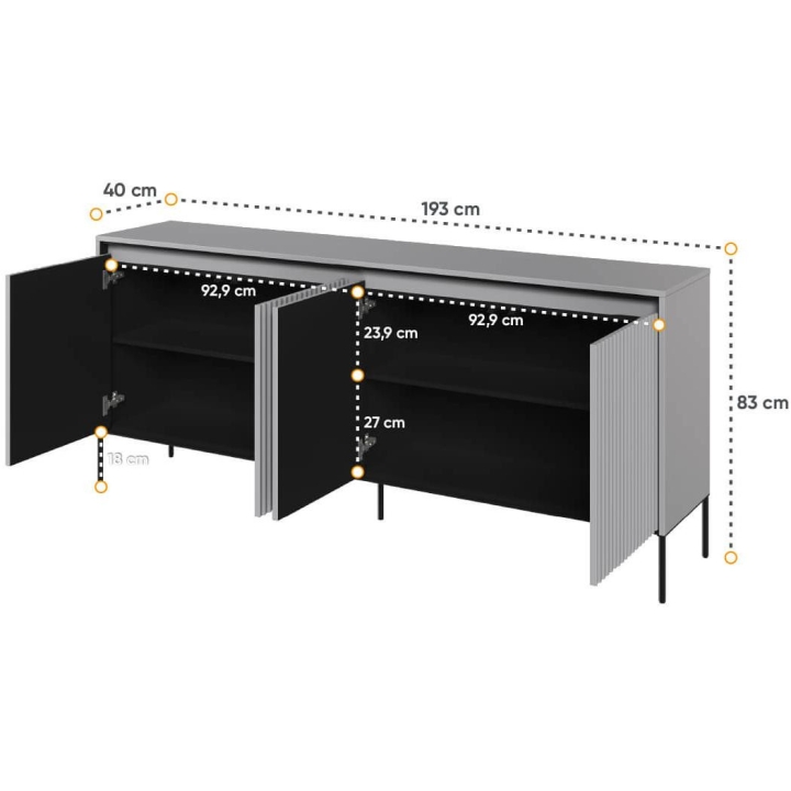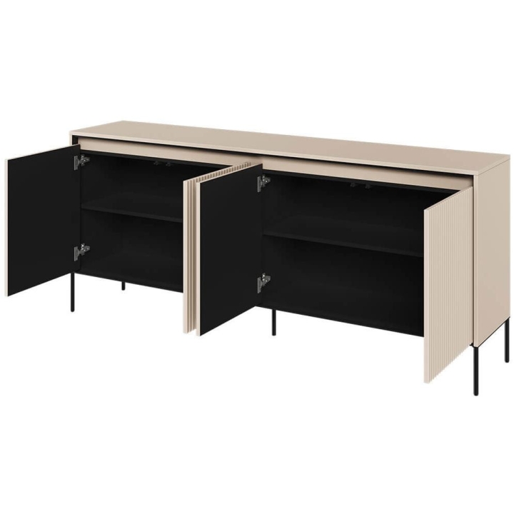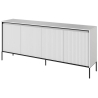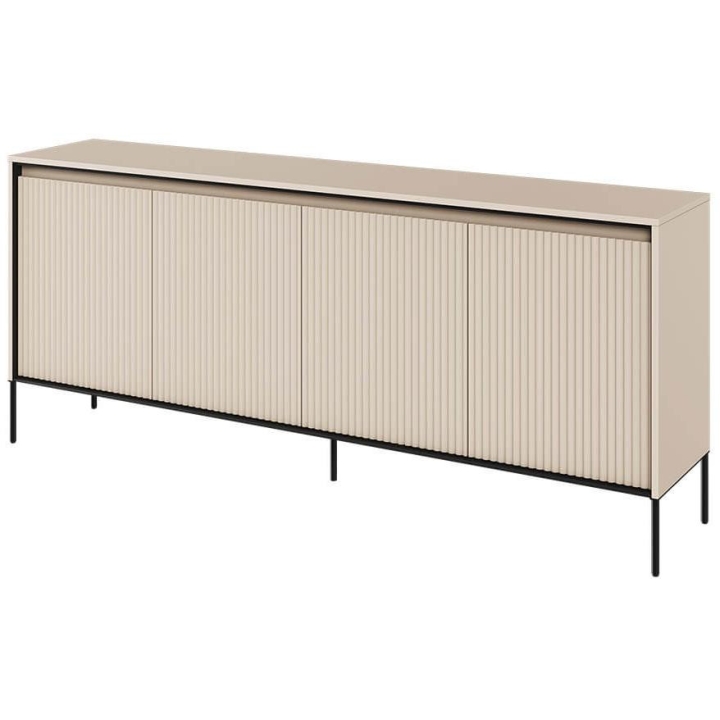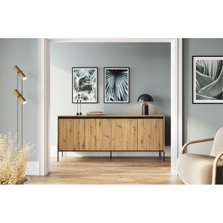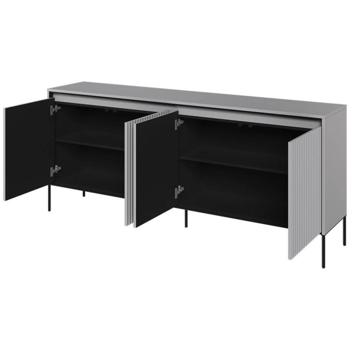 The Trend collection chest of drawers is a timeless piece of furniture made from durable laminated board in five decors - white, sand beige, black, artisan oak and grey. This unique piece of furniture, which has LED lighting included, will fit perfectly into modern and classic interiors. Its dimensions - 193 cm wide, 83 cm high, 40 cm deep - allow for storage of books, decorations, bedding and other items, making it extremely practical. The chest of drawers - four doors - is the perfect piece of furniture for displaying your collectables. Assembly requires little effort and the end result is satisfying. The chest of drawers blends perfectly with other pieces from the Trend collection, especially with display cabinets, creating a coherent and functional space. Characteristic elements are the fluted fronts, which add an interesting and unique style to the cabinet. Equipped with a push to open system.