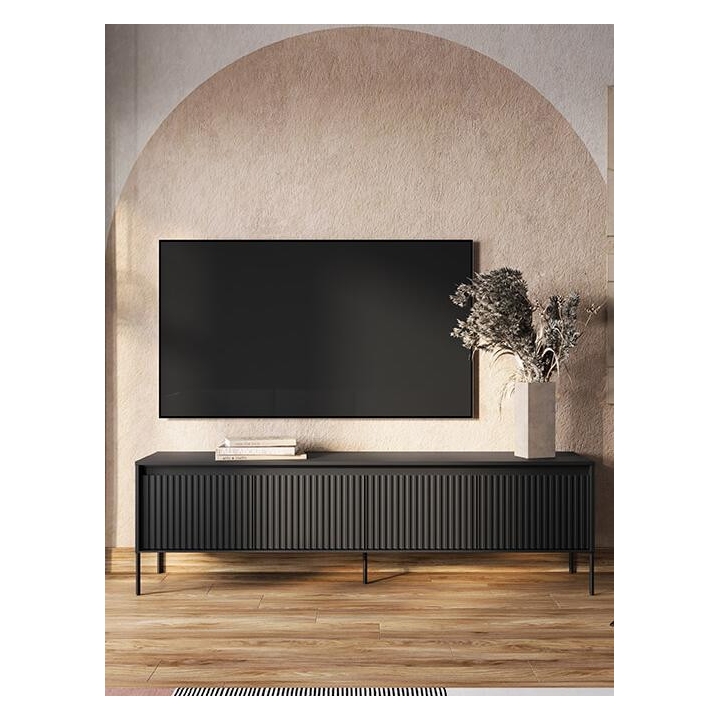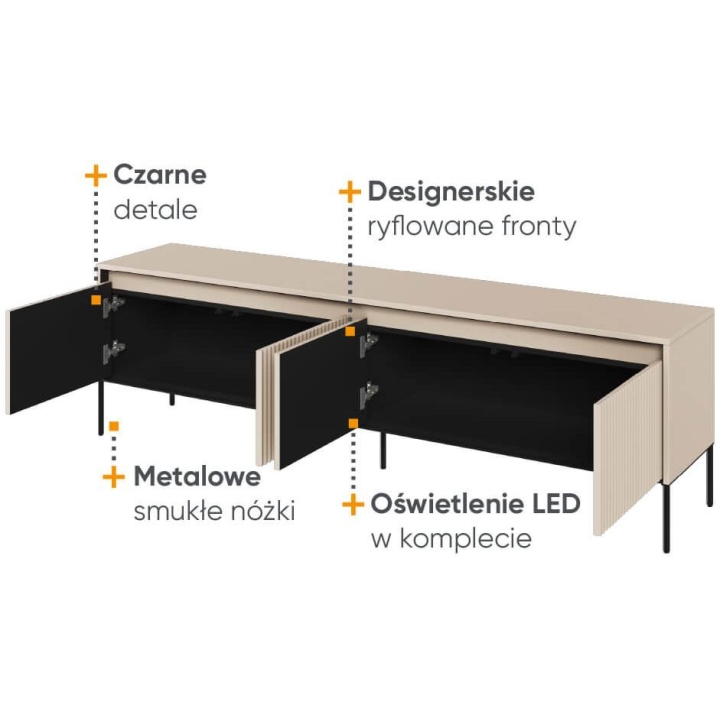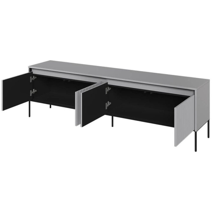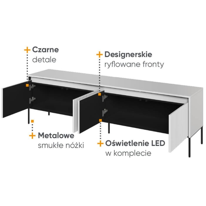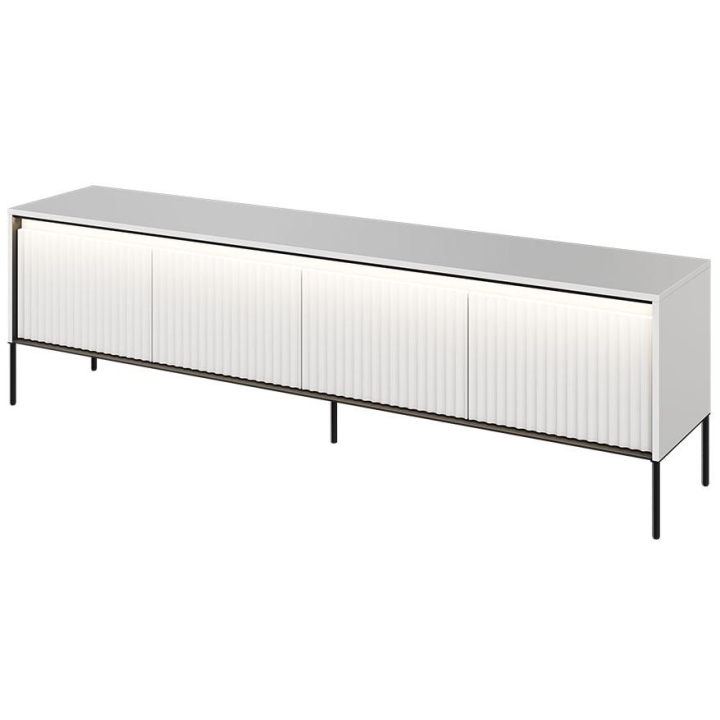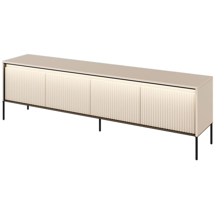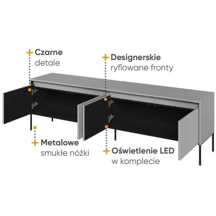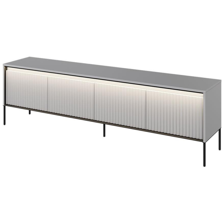 The RTV cabinet from the Trend collection is a timeless piece of furniture made of durable laminated board in five decors - white, sand beige, black, artisan oak and grey. This unique piece of furniture, which has LED lighting included, will fit perfectly into modern and classic interiors. Its dimensions - 193 cm wide, 56 cm high, 40 cm deep - allow for storage of books, decorations, bedding and other items, making it extremely practical. The cabinet - with four doors - is the perfect piece of furniture for displaying your collectables. Assembly requires little effort and the end result is satisfying. The RTV cabinet blends perfectly with other pieces from the Trend collection, especially with display cabinets, creating a coherent and functional space. Characteristic elements are the fluted fronts, which add an interesting and unique style to the cabinet. Equipped with a push to open system.
