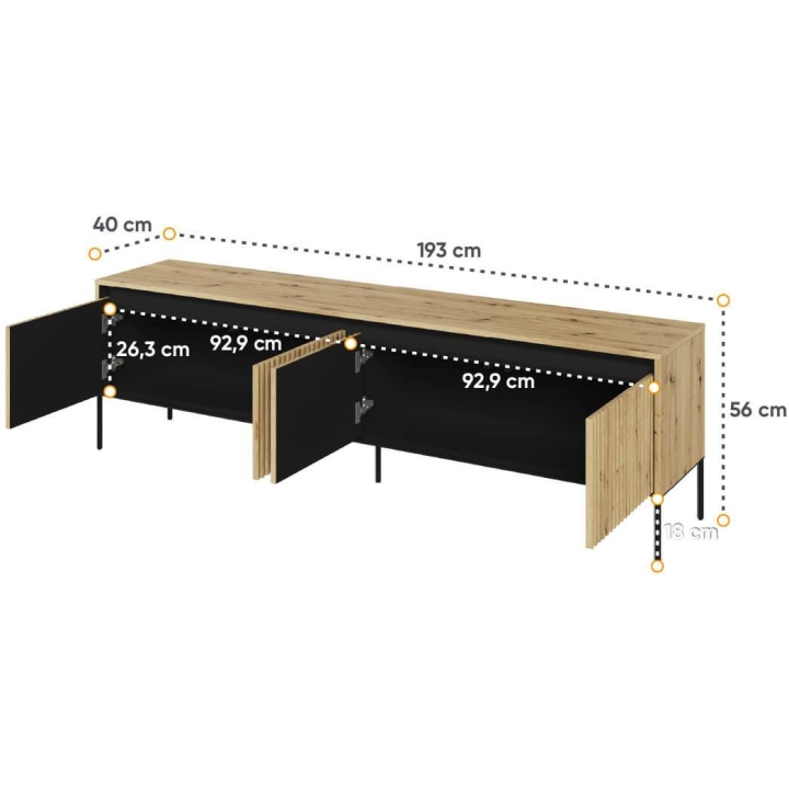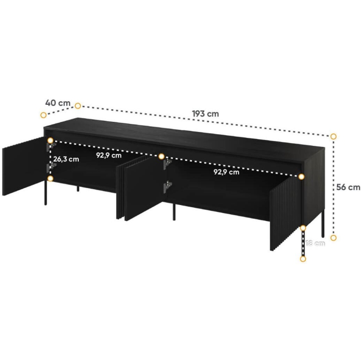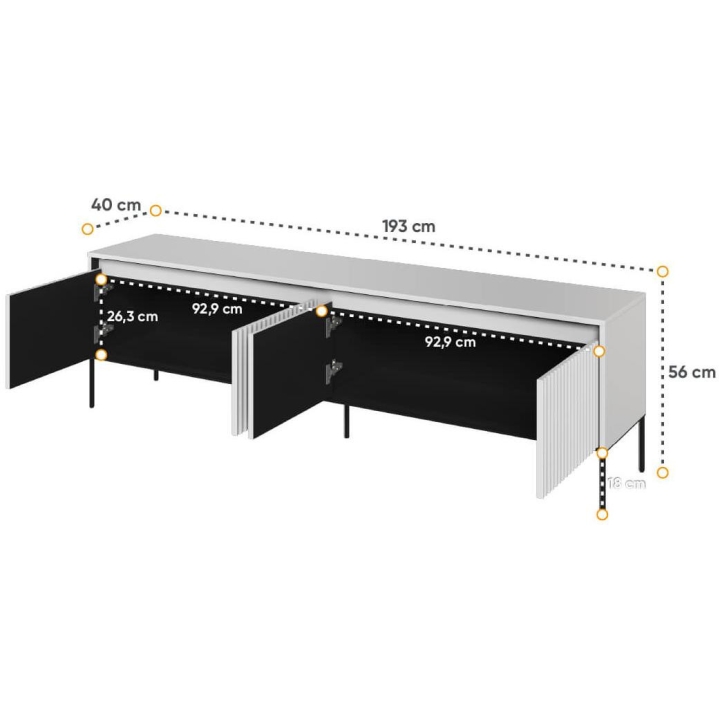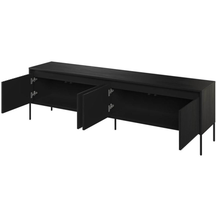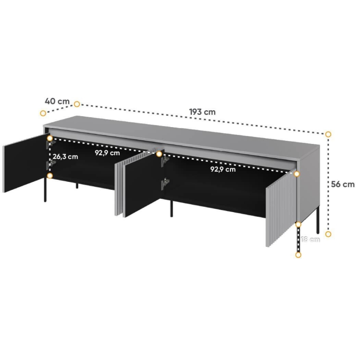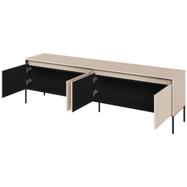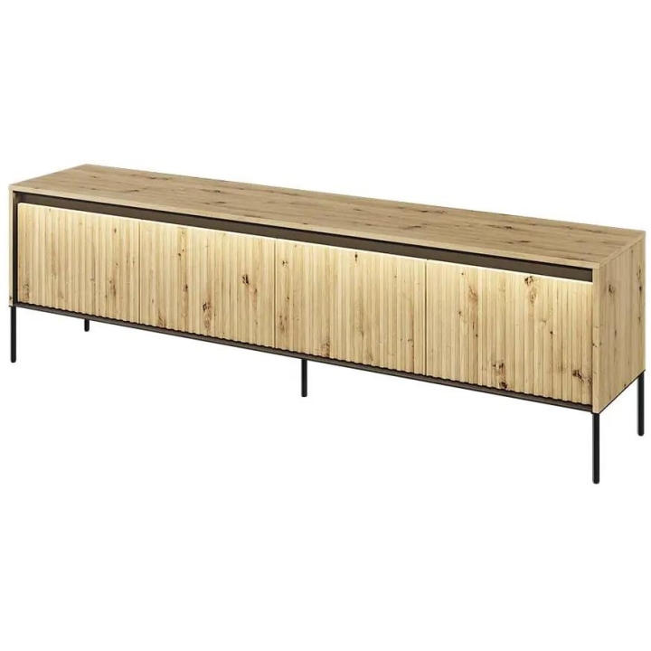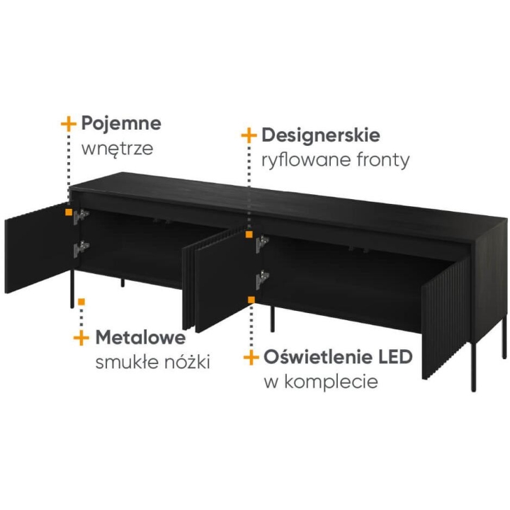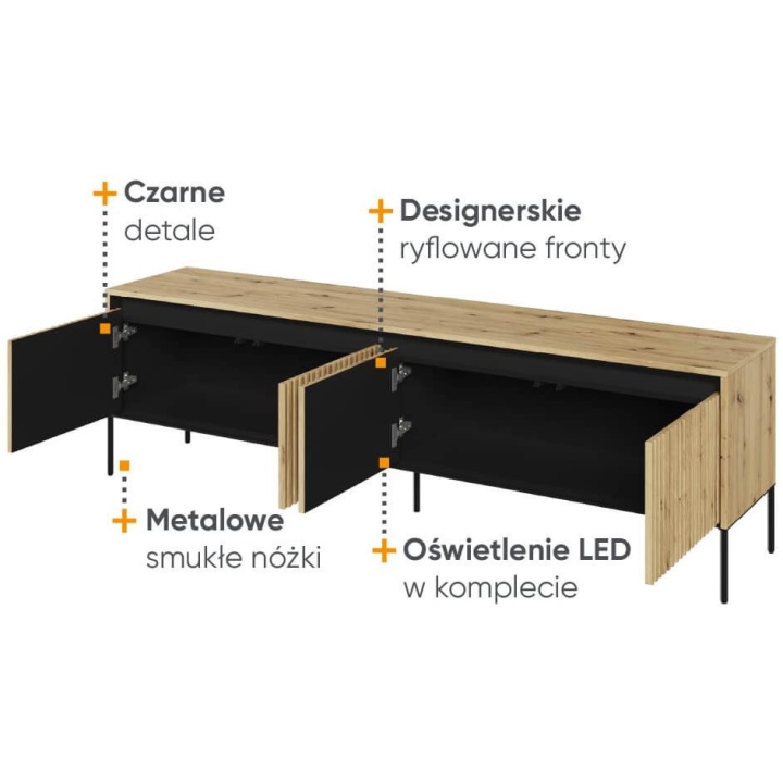 The RTV cabinet from the Trend collection is a timeless piece of furniture made of durable laminated board in five decors - white, sand beige, black, artisan oak and grey. This unique piece of furniture, which has LED lighting included, will fit perfectly into modern and classic interiors. Its dimensions - 193 cm wide, 56 cm high, 40 cm deep - allow for storage of books, decorations, bedding and other items, making it extremely practical. The cabinet - with four doors - is the perfect piece of furniture for displaying your collectables. Assembly requires little effort and the end result is satisfying. The RTV cabinet blends perfectly with other pieces from the Trend collection, especially with display cabinets, creating a coherent and functional space. Characteristic elements are the fluted fronts, which add an interesting and unique style to the cabinet. Equipped with a push to open system.