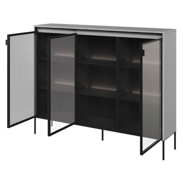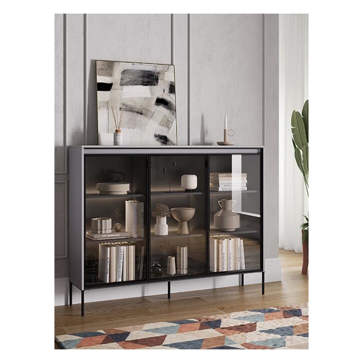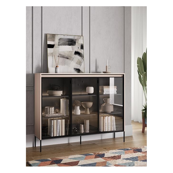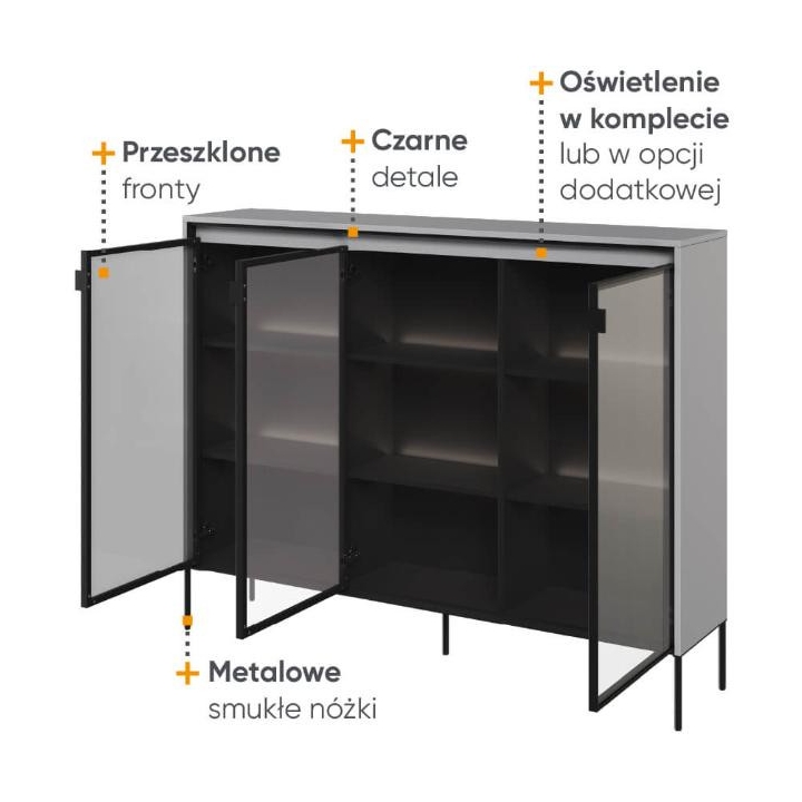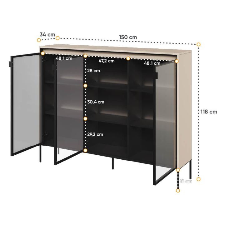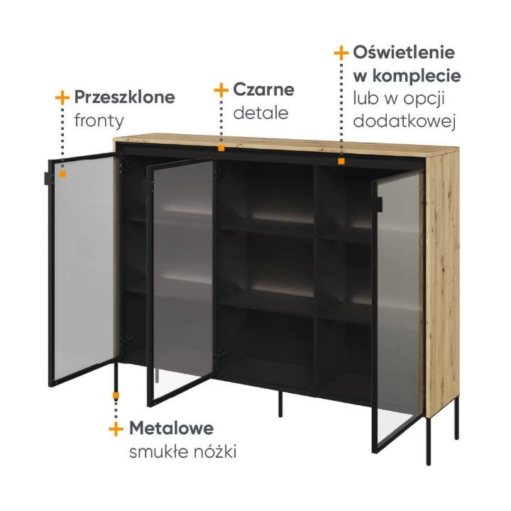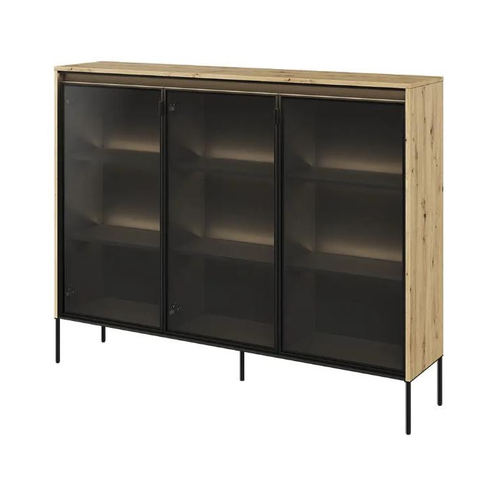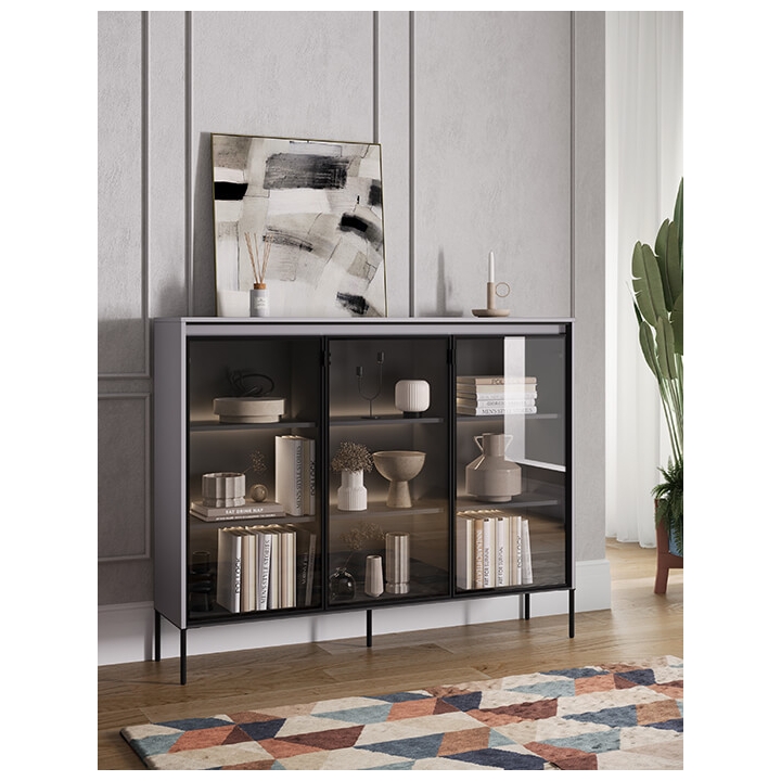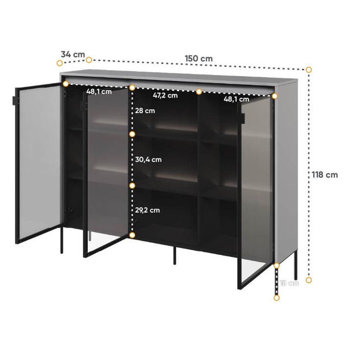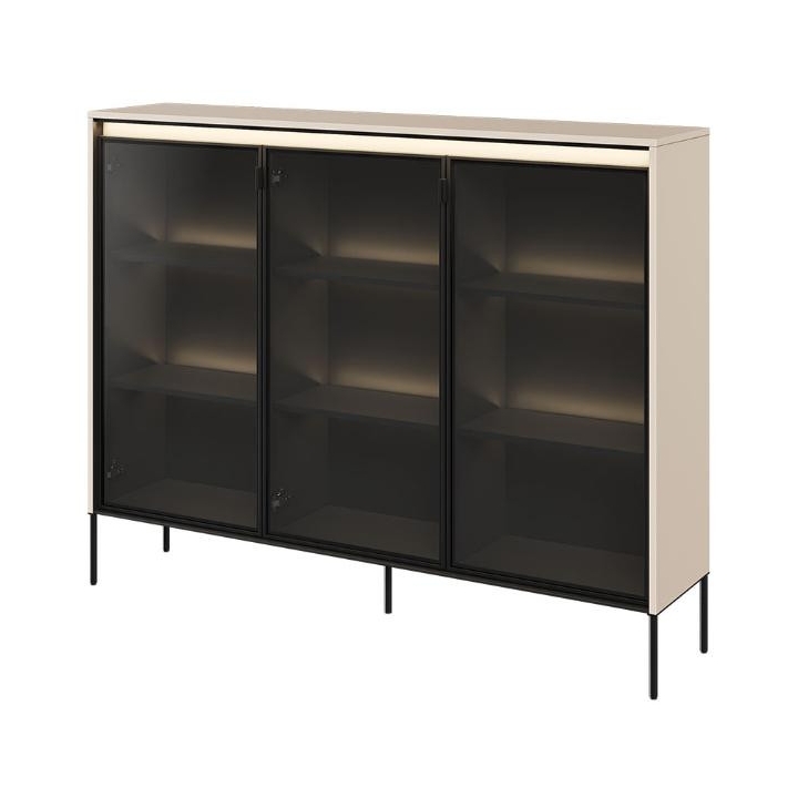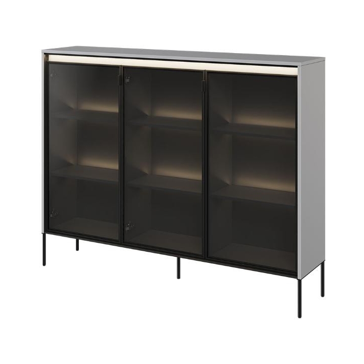 The Trend collection showcase is a timeless piece of furniture made from durable laminated board in five decors - white, sand beige, black, artisan oak and grey. This unique piece of furniture, which has LED lighting included, will fit perfectly into modern and classic interiors. Its dimensions - 150 cm wide, 118 cm high, 34 cm deep - allow for storage of books, decorations, tableware and other items, making it extremely practical. The vitrine - three doors, is the perfect piece of furniture to display your collectables. Assembly requires little effort and the end result is satisfying. The display cabinet goes well with other pieces from the Trend collection, especially with the table, creating a coherent and functional space. Characteristic elements are the framed glass fronts, which add an interesting and unique style to the showcase. It is possible to purchase a LED strip - LEDTR8, which will illuminate the shelves.