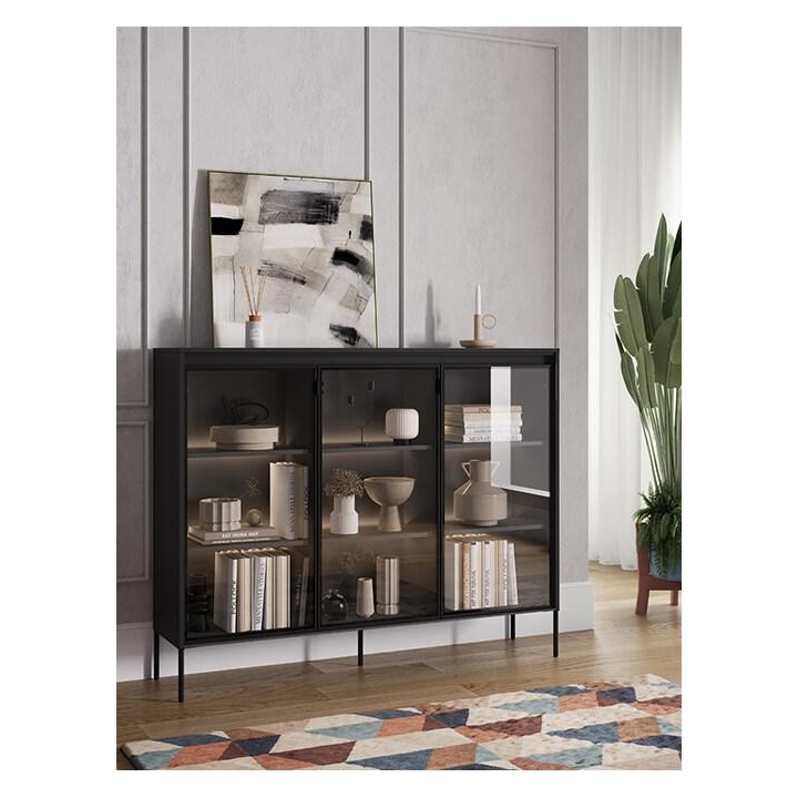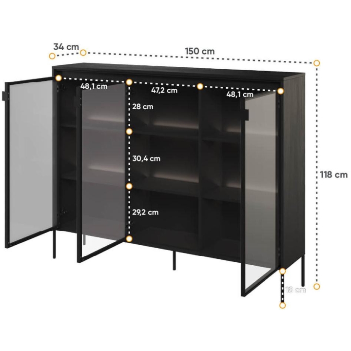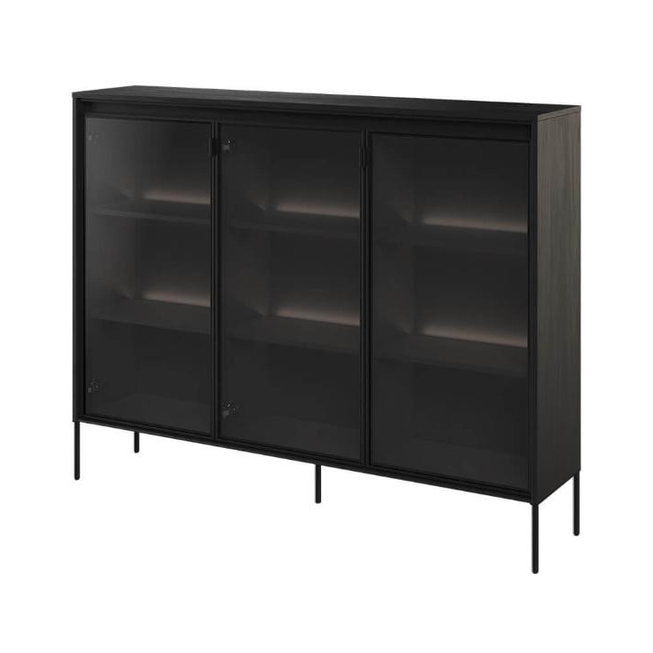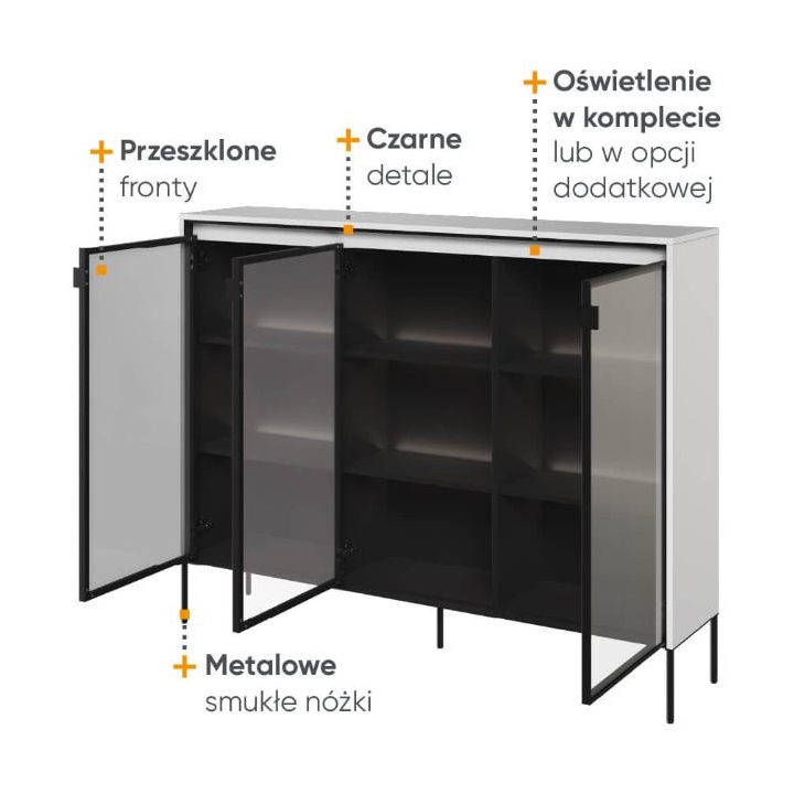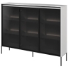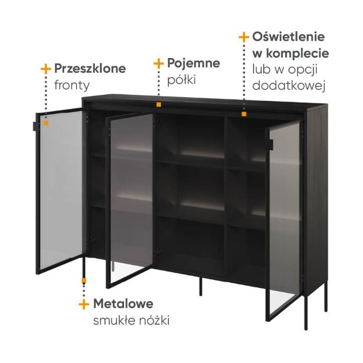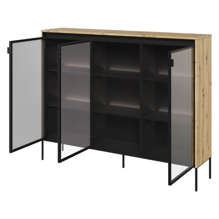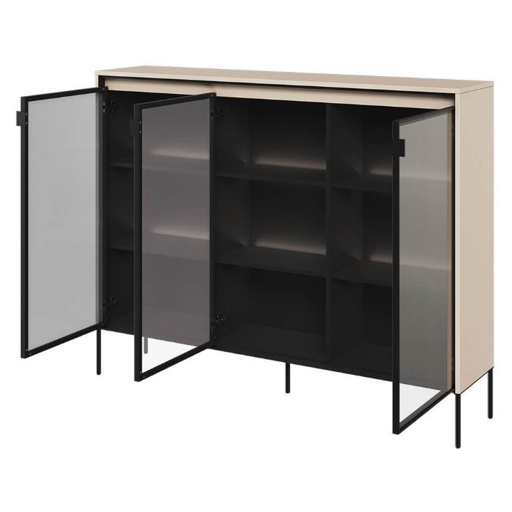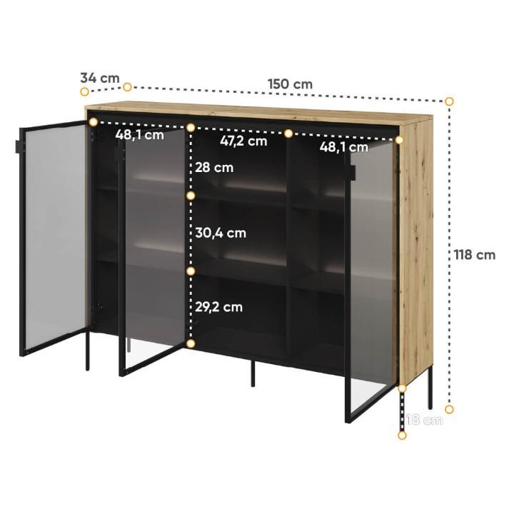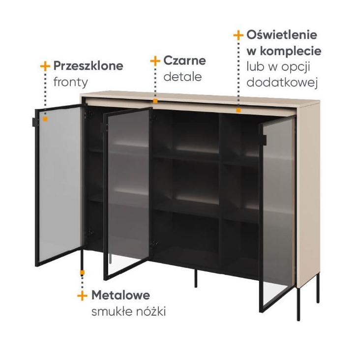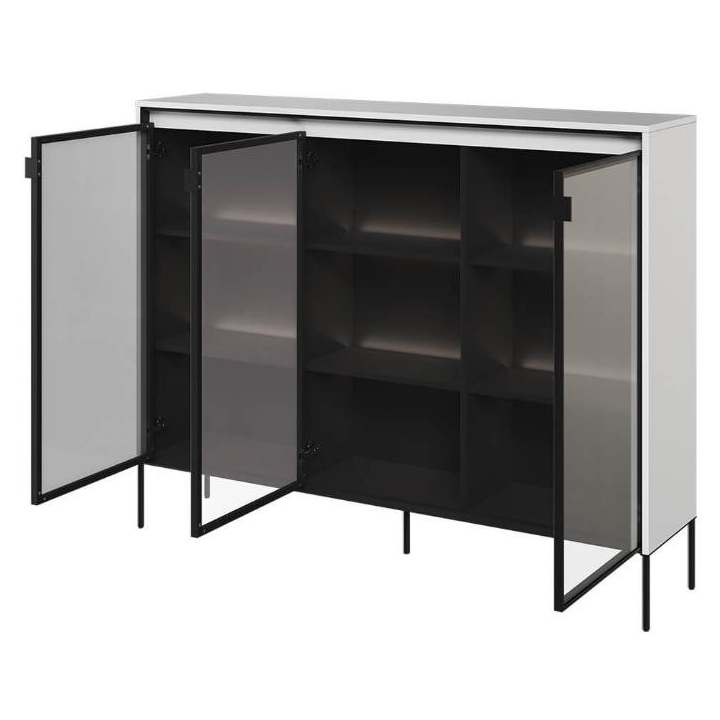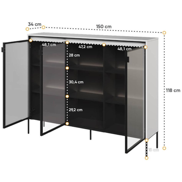 The Trend collection showcase is a timeless piece of furniture made from durable laminated board in five decors - white, sand beige, black, artisan oak and grey. This unique piece of furniture, which has LED lighting included, will fit perfectly into modern and classic interiors. Its dimensions - 150 cm wide, 118 cm high, 34 cm deep - allow for storage of books, decorations, tableware and other items, making it extremely practical. The vitrine - three doors, is the perfect piece of furniture to display your collectables. Assembly requires little effort and the end result is satisfying. The display cabinet goes well with other pieces from the Trend collection, especially with the table, creating a coherent and functional space. Characteristic elements are the framed glass fronts, which add an interesting and unique style to the showcase. It is possible to purchase a LED strip - LEDTR8, which will illuminate the shelves.