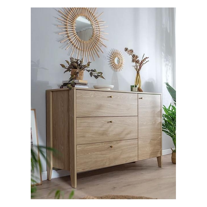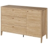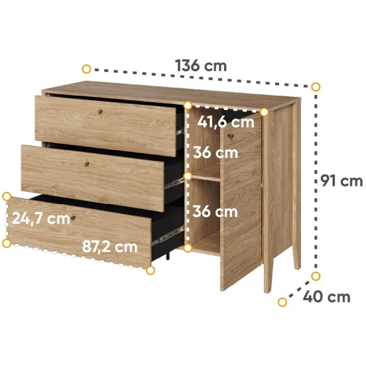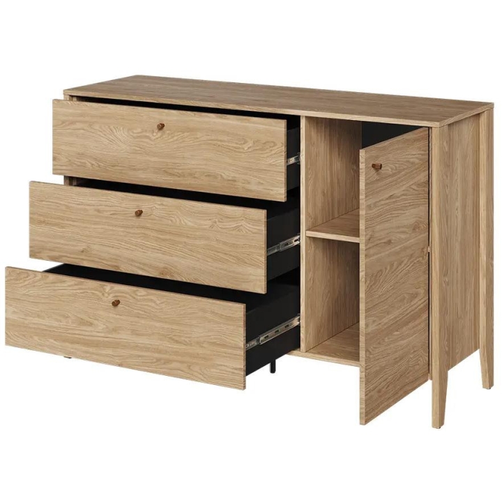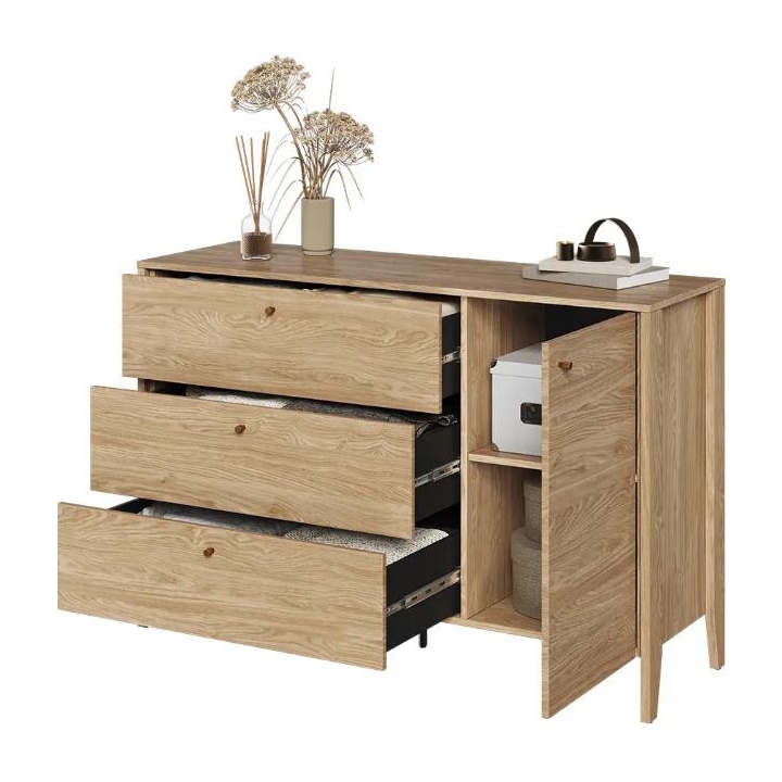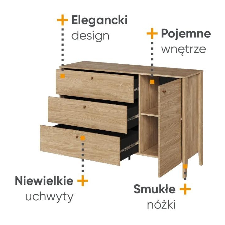 The chest of drawers from the Cozy collection is a timeless piece of furniture made of durable laminated board in oiled oak décor, which fits perfectly into modern and classic interiors. Its dimensions - 136 cm wide, 91 cm high, 40 cm deep - allow for storage of clothes, bedding and other items, making it extremely practical. The chest of drawers is equipped with 3 capacious drawers and a door hiding the roomy space. Assembly requires little effort and the end result is satisfying. The chest goes well with other pieces from the Cozy collection, especially with the wardrobe, creating a coherent and functional space. Characteristic elements are the high legs, which add an interesting and minimalist style to the chest.