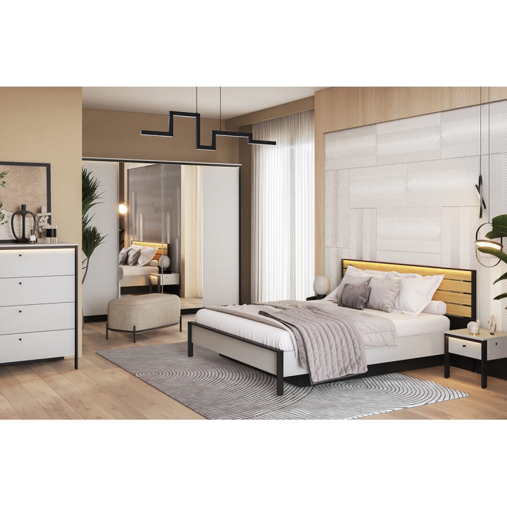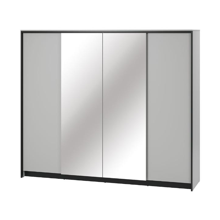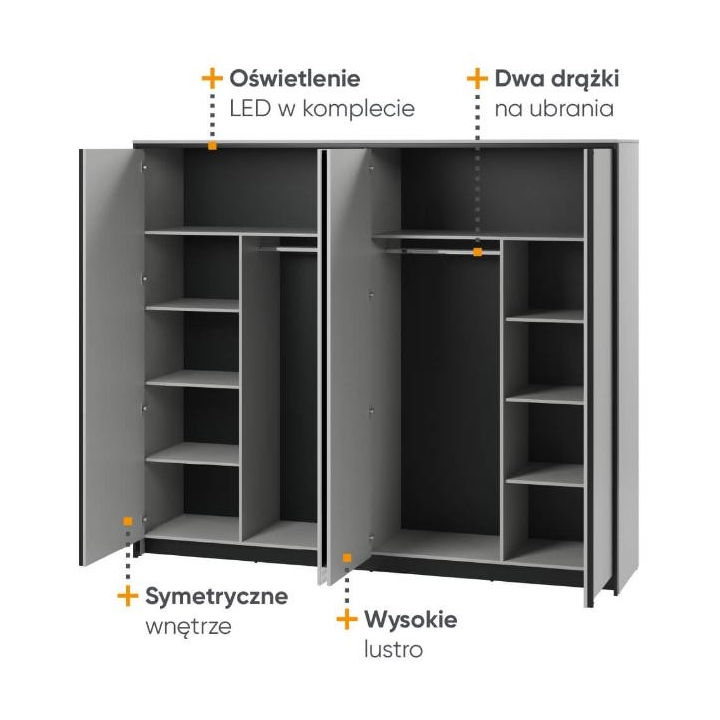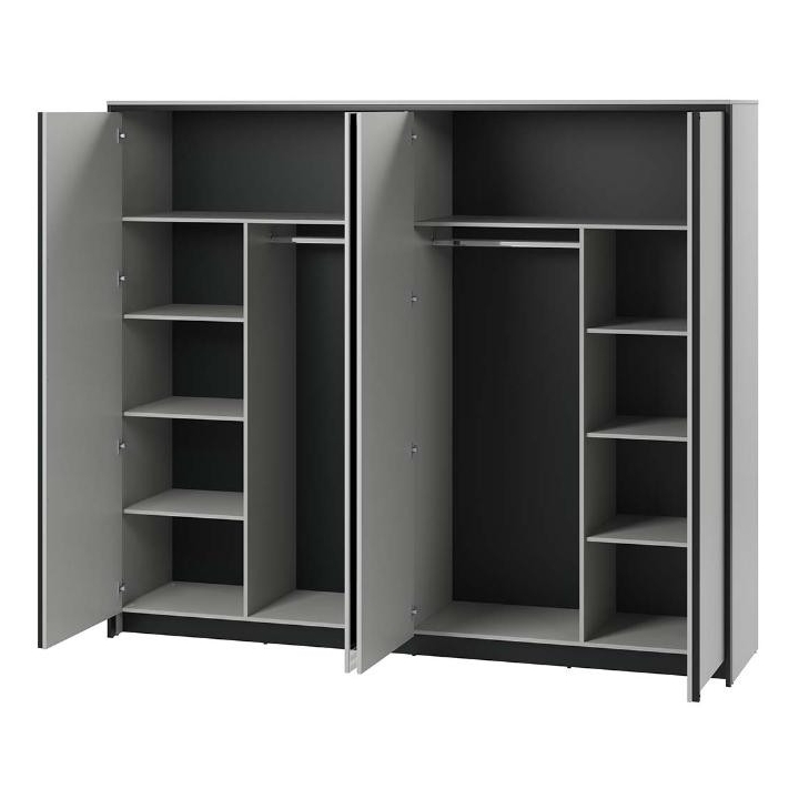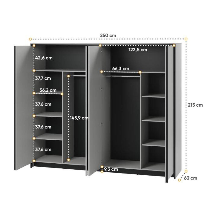 The wardrobe in grey/black is the perfect solution for the bedroom, combining functionality and aesthetics. Measuring250 cm wide, 215 cm high and 63 cm deep, this piece of furniture will provide practical and attractive storage space that will fit perfectly into your bedroom décor. Equipped with 12 shelves, 2 wardrobe rods and lighting, this wardrobe offers plenty of space for clothes, shoes and other essential items. With four doors and four compartments, it's easy to keep your belongings tidy and organised. The sturdy construction and careful finish guarantee durability and functionality. In addition, LED lighting adds elegance and makes the wardrobe a focal point in the bedroom. Let our GRIS collection wardrobe become an integral part of your bedroom, ensuring order and aesthetics in your living space.