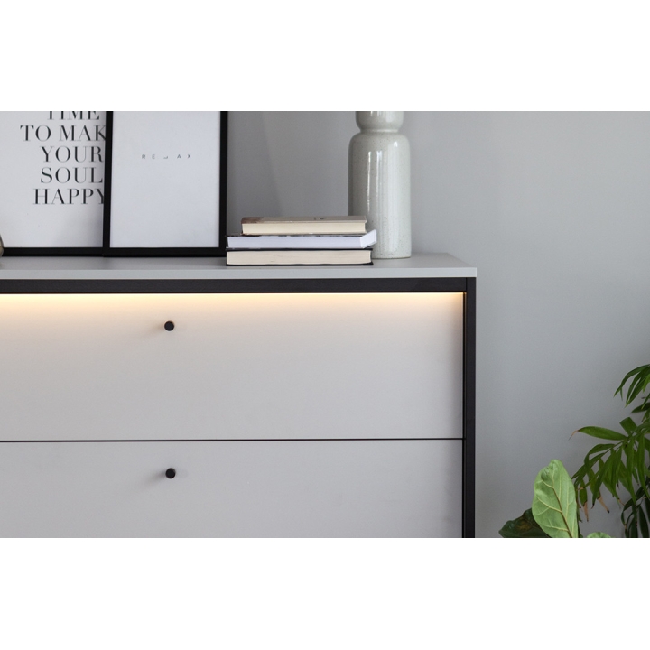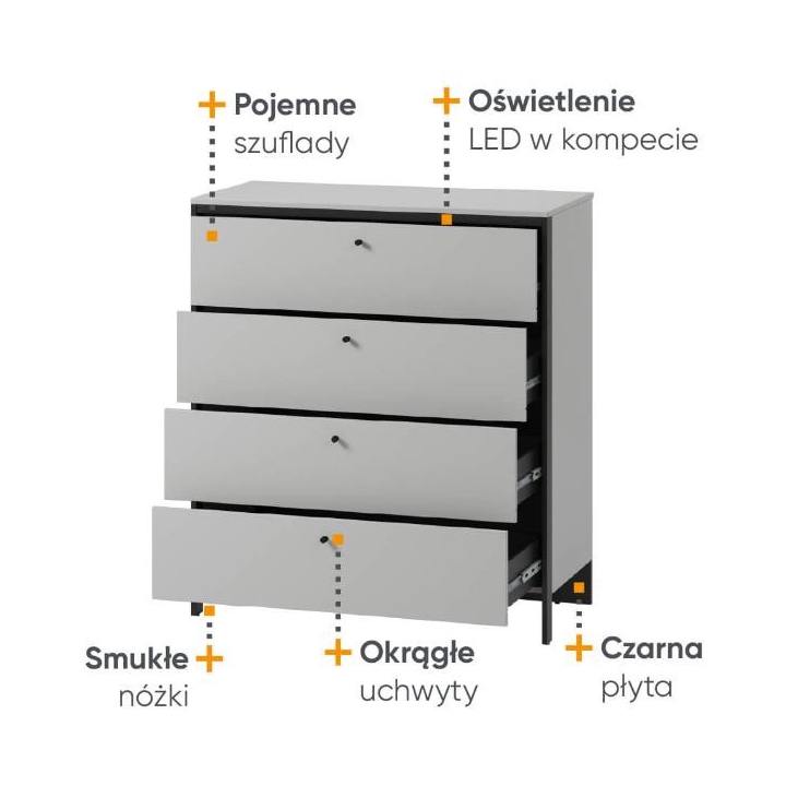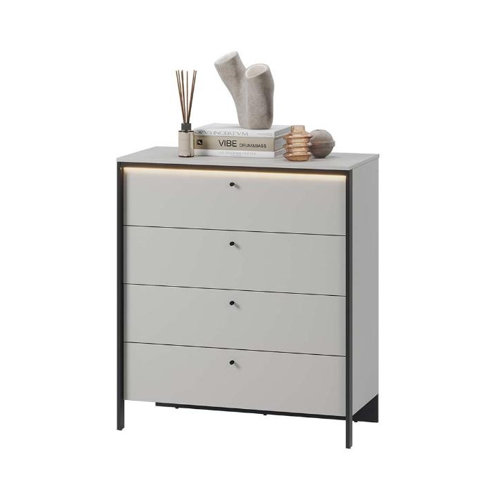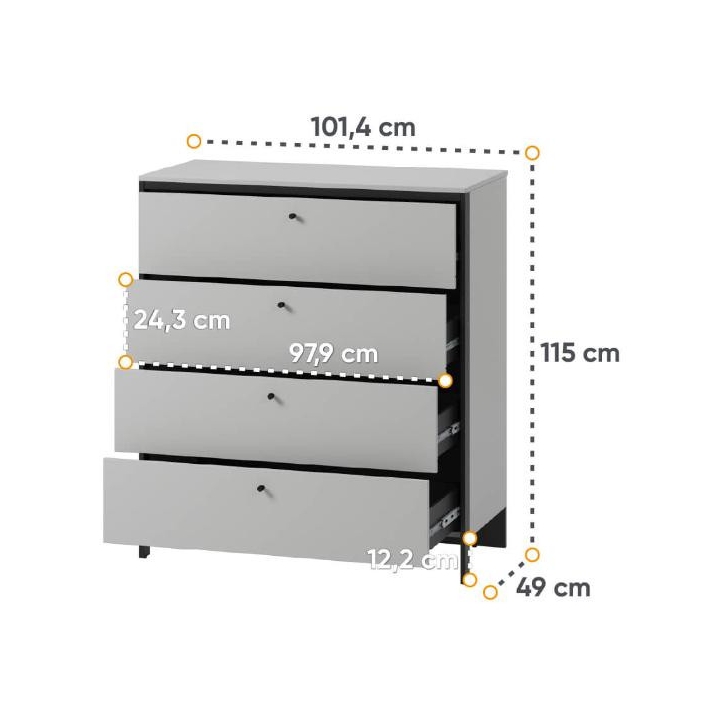 Ideal for the bedroom, theGris chest of drawers with four capacious drawersin grey/black is the perfect storage solution for clothes and accessories. Measuring 101 cm wide, 115 cm high and 49 cm deep, the furniture has LED lighting which adds to its elegant and modern look. The GRIS chest of drawers is not only a functional piece of furniture, but also a decorative element which emphasises the character of the interior. The solid construction and careful workmanship guarantee durability and strength. In addition, four drawers allow for easy and convenient sorting of things, which makes it easier to maintain order in the bedroom. It is a practical and stylish solution for any bedroom.