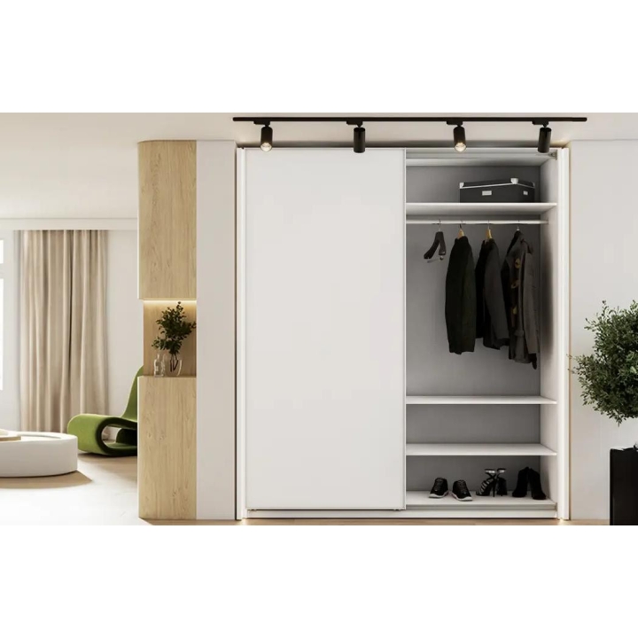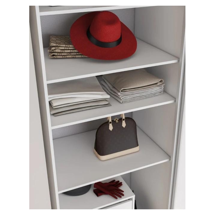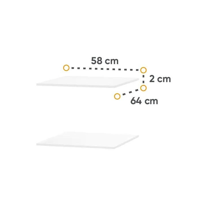 Two white Maxi shelves dedicated to the MX-01 wardrobe from the Maxi collection are a practical solution. Measuring 58 cm wide, 64 cm deep and 2 cm high,the shelves fit perfectlyinto the interior of the wardrobe, allowing for convenient storage of smaller items. Thanks to them, it is possible to divide the space into different sections, such as hanging clothes, folded clothes or shoes, making it easier to keep things tidy. In addition, the shelves make better use of the height of the wardrobe, which is important especially in small rooms, contributing to space saving. In addition to their practical function, shelves also add to the aesthetics, helping to keep the interior neat and tidy. They make the interior design more tidy and harmonious.