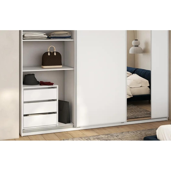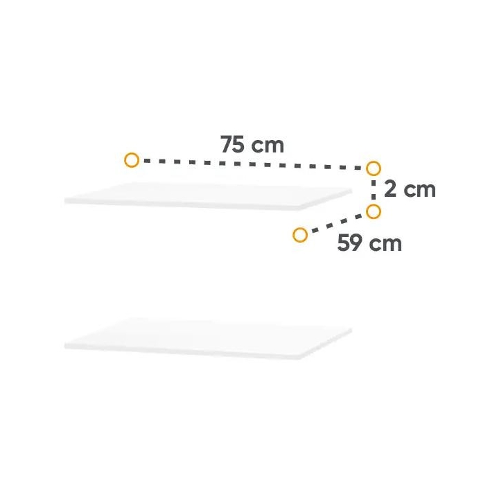 The two white Maxi shelves dedicated to the MX-05 wardrobe from the Maxi collection are a practical solution. Measuring 75 cm wide, 59 cm deep and 2 cm high,the shelves fit perfectlyinto the interior of the wardrobe for convenient storage of smaller items. They make it possible to divide the space into different sections, such as hanging clothes, folded clothes or shoes, making it easier to keep things tidy. In addition, the shelves make better use of the height of the wardrobe, which is important especially in small rooms, contributing to space saving. In addition to their practical function, shelves also add to the aesthetics, helping to keep the interior neat and tidy. They make the interior design more tidy and harmonious.