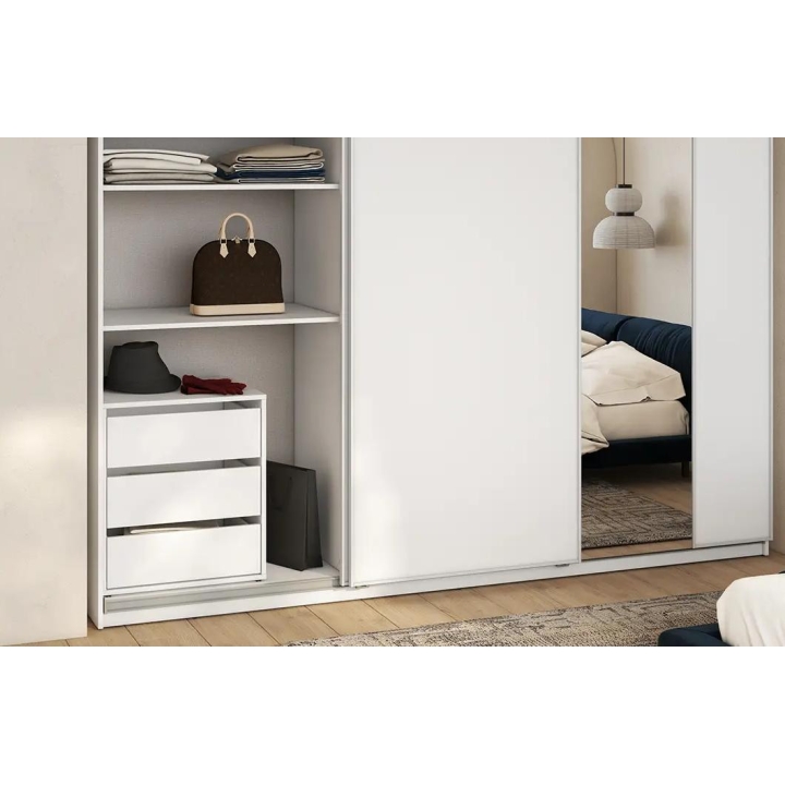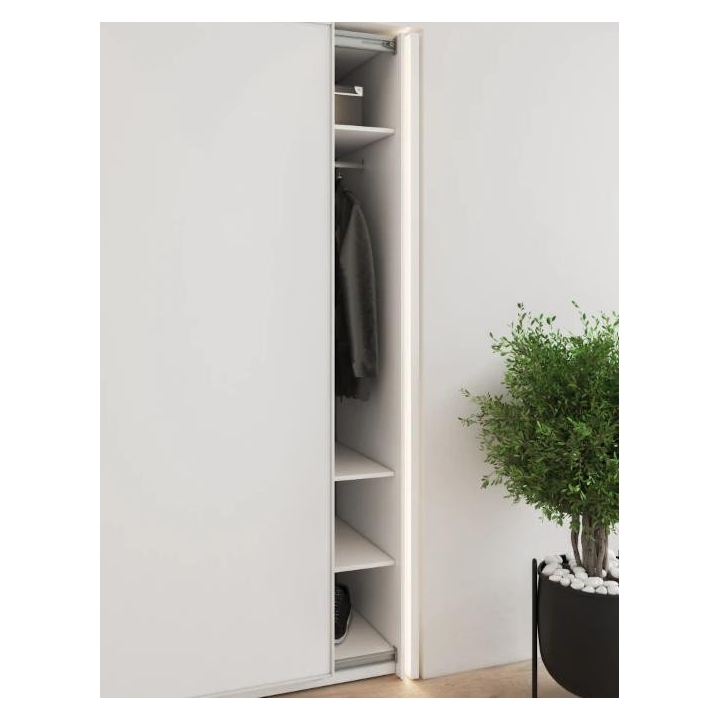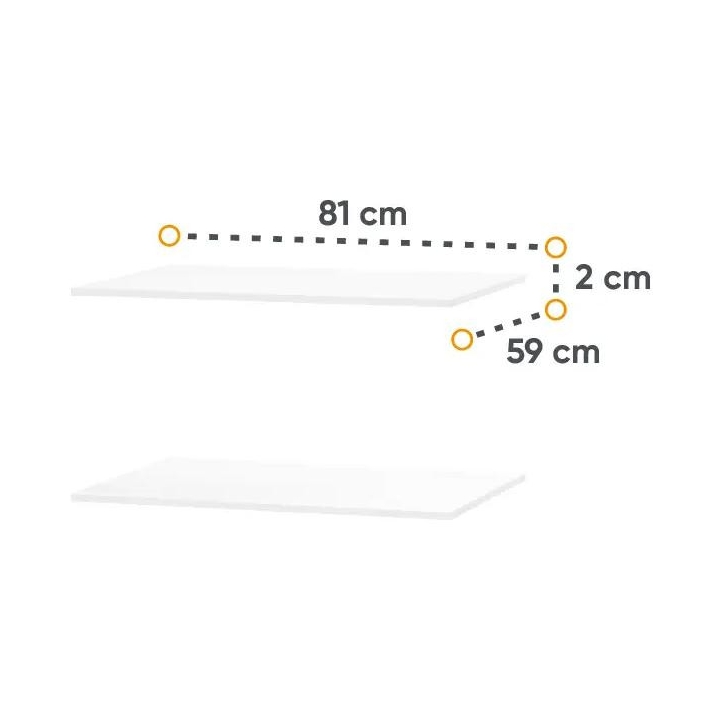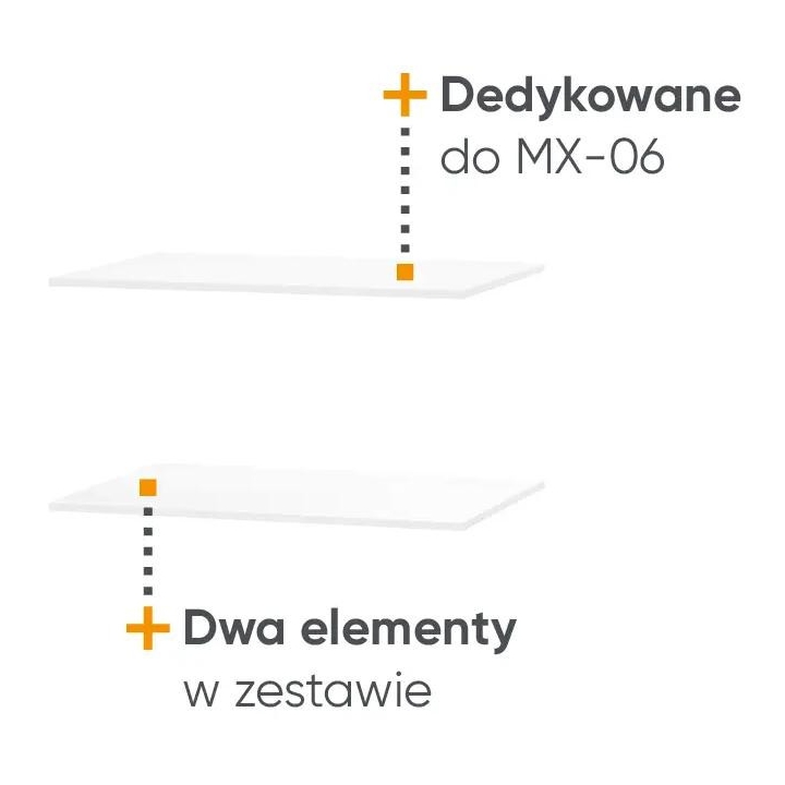Two white Maxi shelves dedicated to the MX-06 wardrobe from the Maxi collection are a practical solution. Measuring 81 cm wide, 59 cm deep and 2 cm high,the shelves fit perfectlyinto the interior of the wardrobe, allowing for convenient storage of smaller items. They make it possible to divide the space into different sections, such as hanging clothes, folded clothes or shoes, making it easier to keep things tidy. In addition, the shelves make better use of the height of the wardrobe, which is important especially in small rooms, contributing to space saving. In addition to their practical function, shelves also add to the aesthetics, helping to keep the interior neat and tidy. They make the interior design more tidy and harmonious.