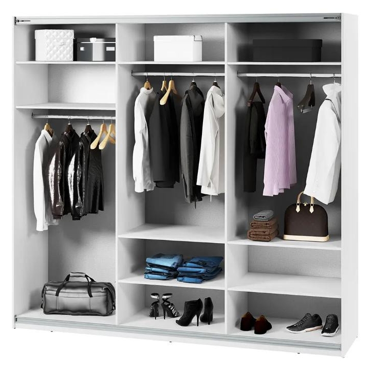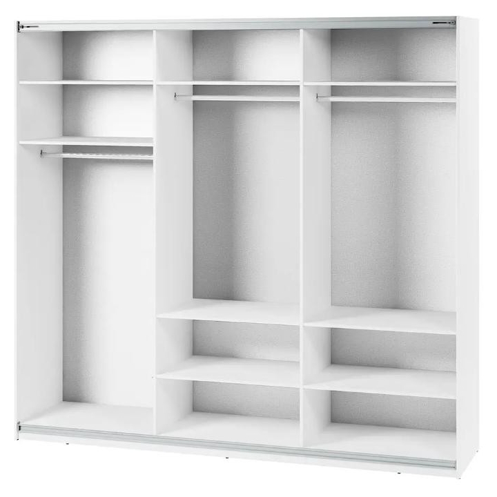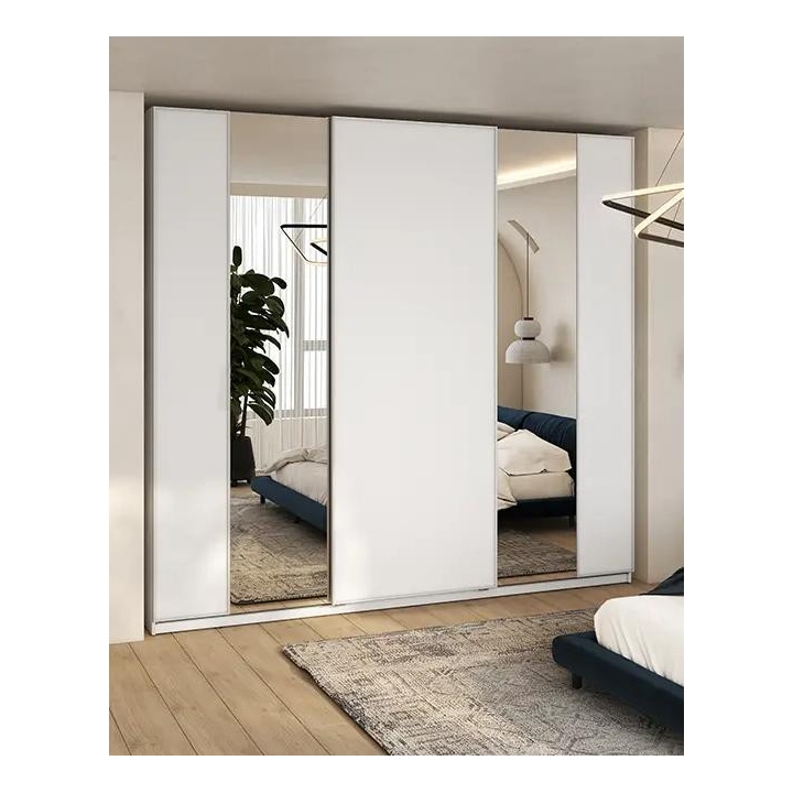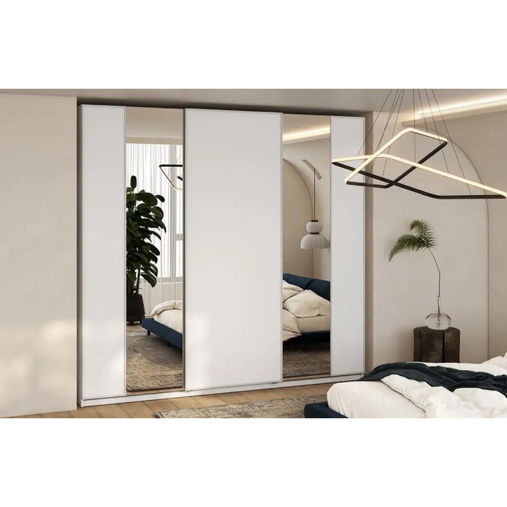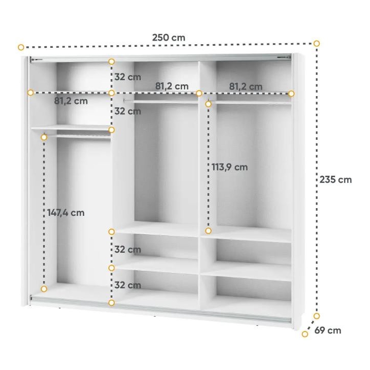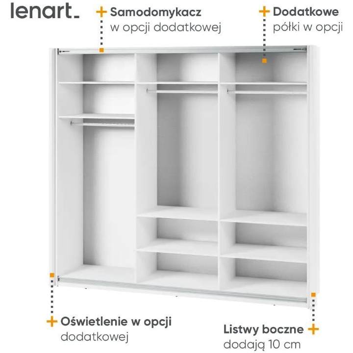 The white Maxi sliding wardrobe, with mirror, is not only a practical storage solution, but also a design element that will give your space a modern and elegant touch. With a width of 220 cm, a height of 235 cm and a depth of 69 cm, the sliding wardrobe is the perfect choice for those who want to make the most of the available space without compromising on aesthetics. With a mirror on the front, the wardrobe not only optically enlarges the space, but also facilitates the daily organisation of the wardrobe, adding elegance. Appropriately arranged 11 shelves and 3 rods allow for convenient storage of a variety of wardrobe items. The solid construction ensures durability and satisfaction with use for many years. The furniture in white is a universal solution, which goes well with various interior arrangements. Invest in elegance and functionality with the white Maxi sliding wardrobe. Additional elements that can be added to the wardrobe include: a self-closing device for sliding doors, side rails with lighting, a pedestal, as well as shelves. The wardrobe is sold without lighting.