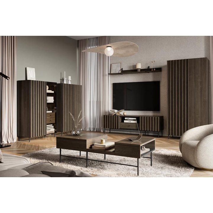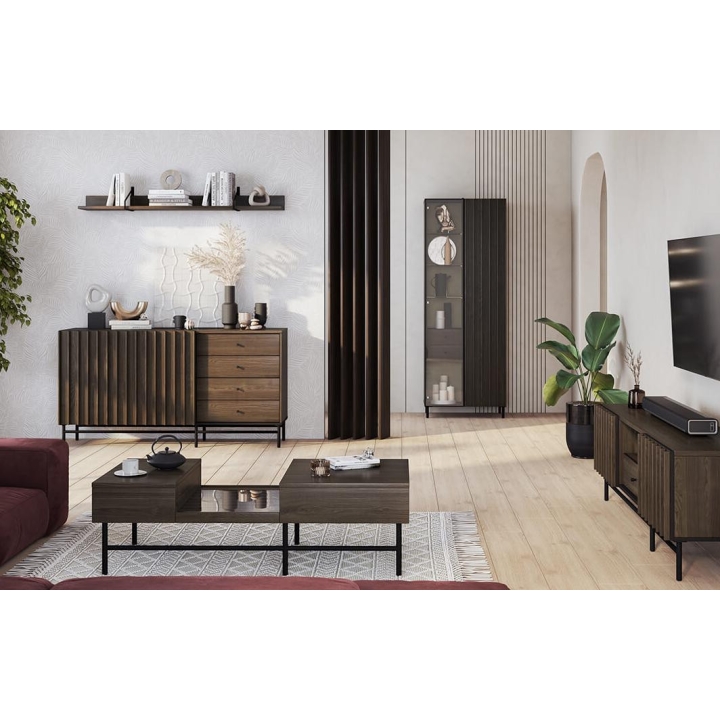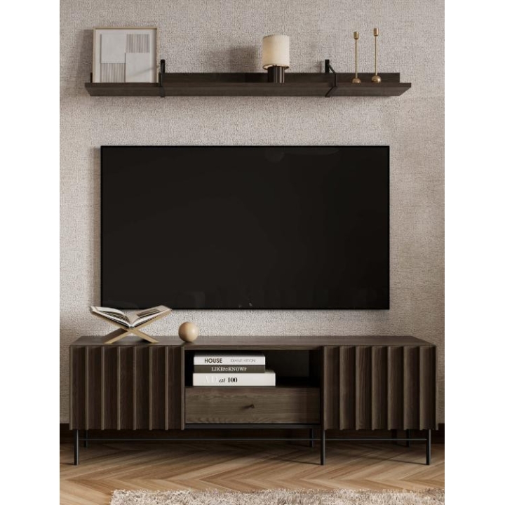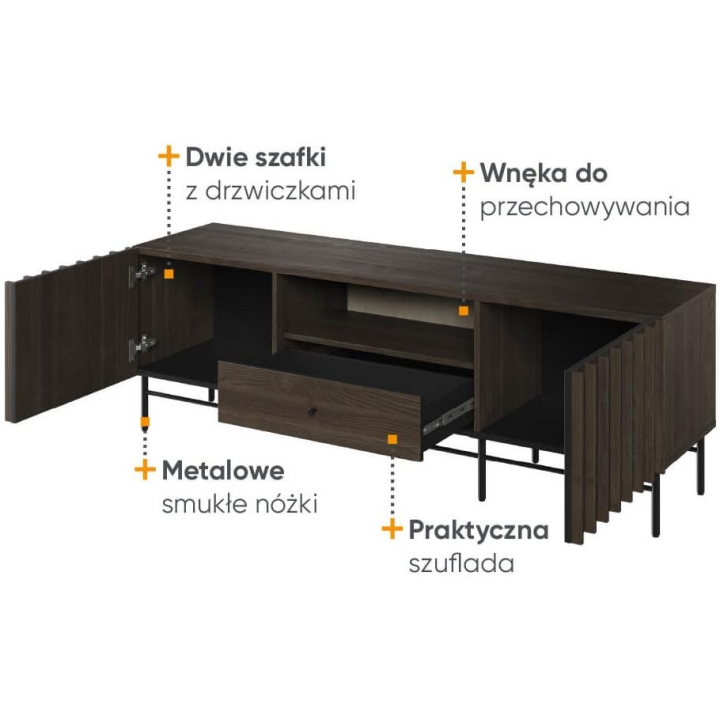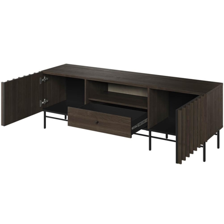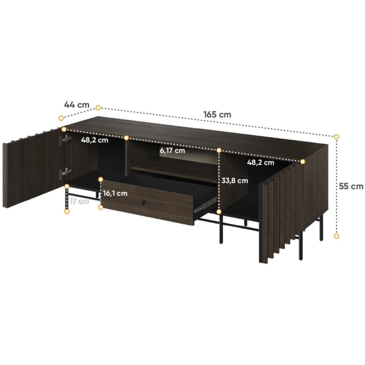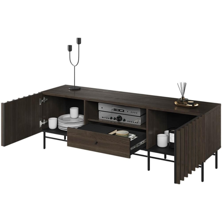 The Piemonte RTV cabinet, in the colours portland ash/black/blacksmith, is the perfect combination of elegance and functionality. Measuring 165 cm wide, 55 cm high and 44 cm deep, this piece of furniture is equipped with a shelf and is ideal for living room arrangements. Thanks to its modern style, it fits perfectly into a variety of interiors. The furniture needs to be assembled, but thanks to the intuitive instructions it should not be a problem. The fronts of the cabinet are fluted and make the cabinet stand out brilliantly, further ensuring comfort of use. The RTV cabinet has a thoughtful design with a large recess for multimedia equipmentand two practical cabinets for accessories.