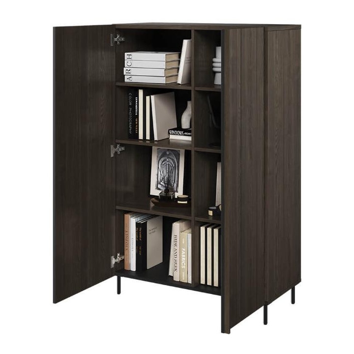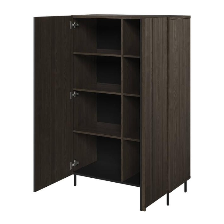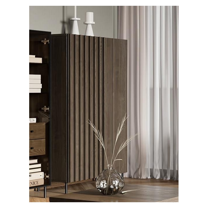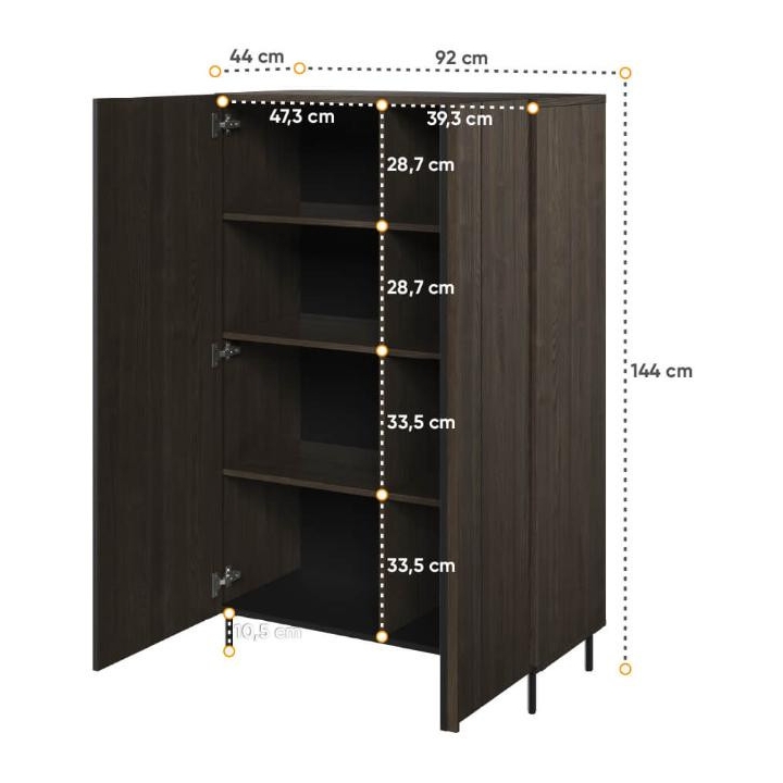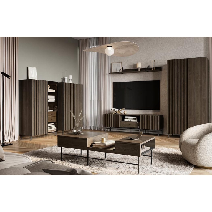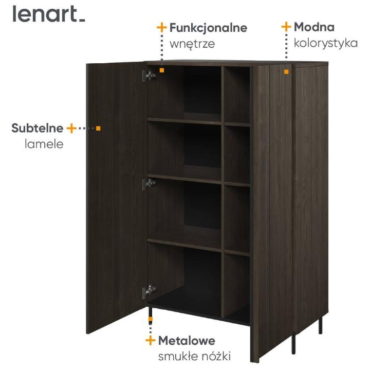 The Piemonte two-door cabinet, in portland ash/black, is the perfect combination of elegance and functionality. Measuring 165 cm wide, 55 cm high and 44 cm deep, this piece of furniture is equipped with 8 shelves and is ideal for living room arrangements. Thanks to its modern style, it fits perfectly into a variety of interiors. The furniture needs to be assembled, but thanks to the intuitive instructions it should not be a problem. The fronts of the cabinet are fluted and perfectly distinguish the cabinet, additionally ensuring comfort of use. The cabinet has a capacious interior, and the high legs add to its elegance.