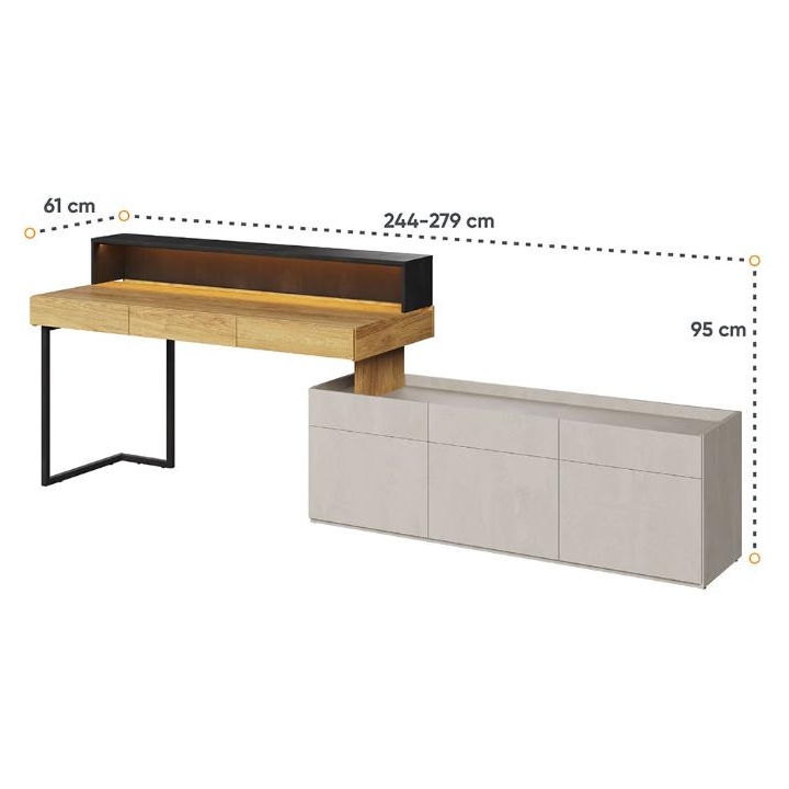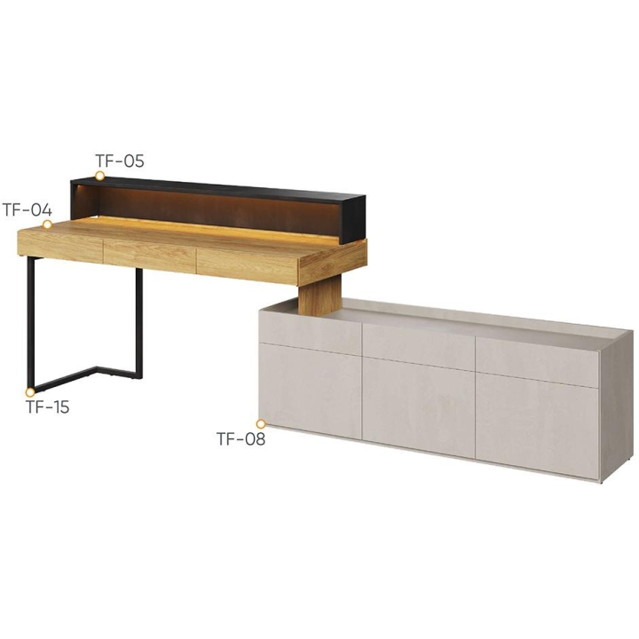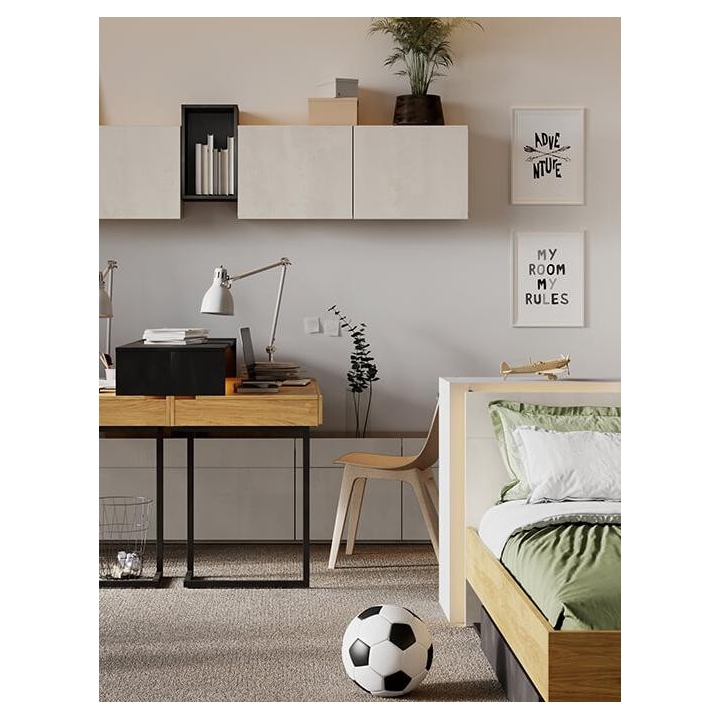 The TEEN FLEX - SET-13A set is a comprehensive solution for a modern youth room, offering not only functionality but also aesthetic design. The furniture is made of durable laminated board in an elegant colour scheme of silk flou, raw steel and natural hickory and looks exceptionally modern. The set includes the TF-08 cupboard, TF-04 desk with TF-05 extension. Their solid construction includes 3 drawers and 3 doors, which provides plenty of space for storing clothes, books or other things. Measuring 279 cm wide, 95 cm high and 61 cm deep, the furniture fits perfectly in a youth room, providing enough space for organisation. Assembly requires a bit of work, but the end result is satisfying. In addition, the cabinet includes 7 shelves that add to its functionality, allowing for efficient space management. This comprehensive set will make furnishing a designer youth room easy and enjoyable.