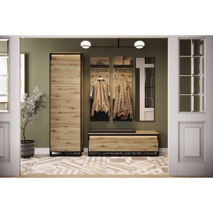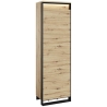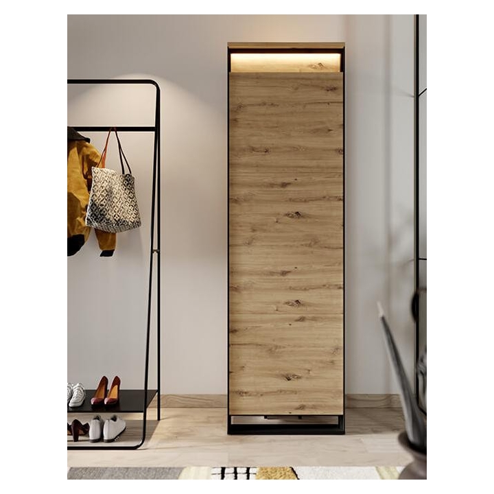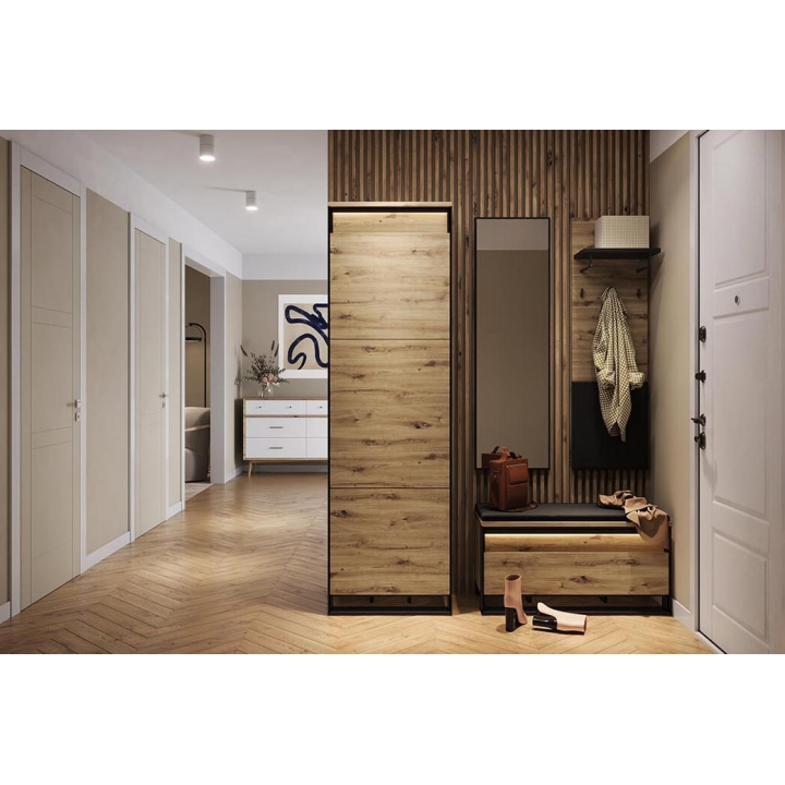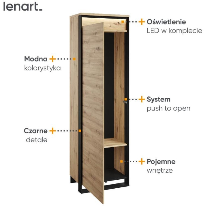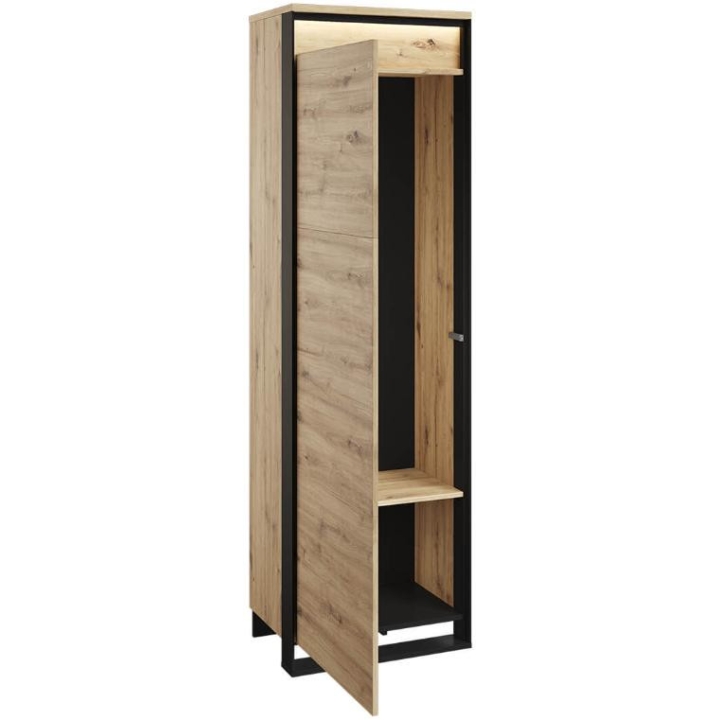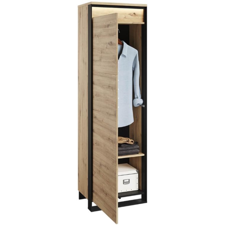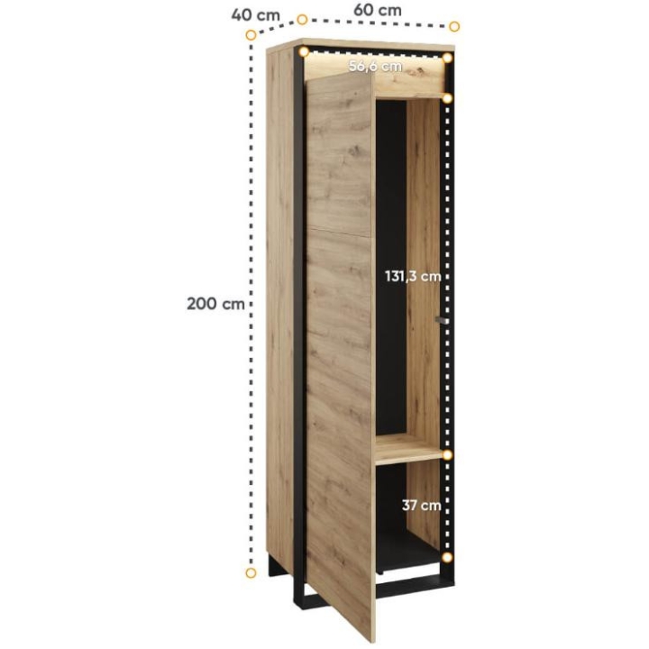 The Quant compact single-door wardrobe in artisan oak/black is a practical and stylish solution for any room, especially for a dressing room or hallway. With a shelf, rod and led lighting included, it provides convenient storage and display of your favourite items. The dimensions of the wardrobe are 60 cm wide, 200 cm high and 40 cm deep. Its small size makes it perfect even in limited spaces. The loft character of the furniture is emphasised by the original decoration and black slender supports, which give it a unique look. The unique front adds a modern touch to the entire composition, while the diffused led lighting creates a pleasant atmosphere both during the day and in the evening. Made from sturdy laminated board with durable ABS edging, the wardrobe guarantees not only aesthetics, but also durability and convenience of use, supported by the PUSH TO OPEN mechanism.