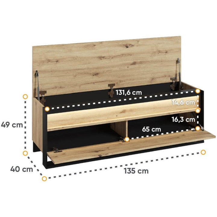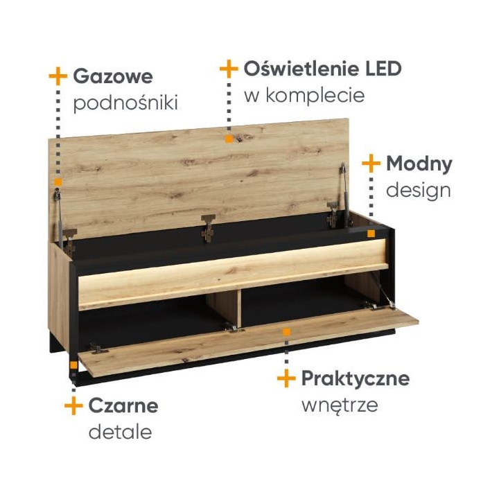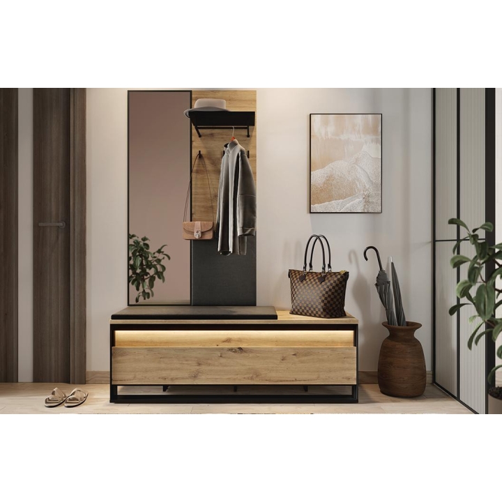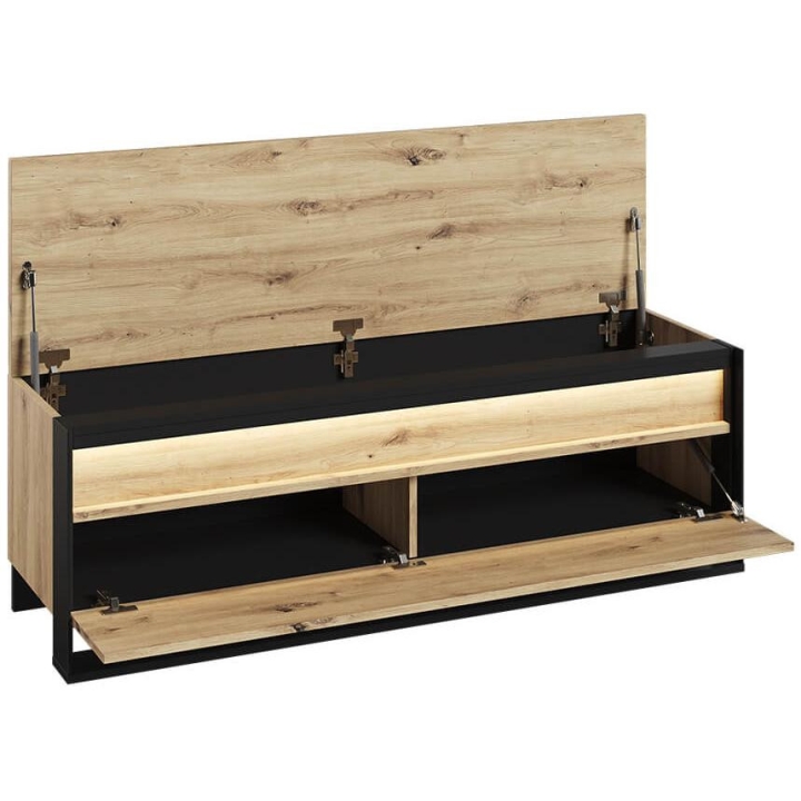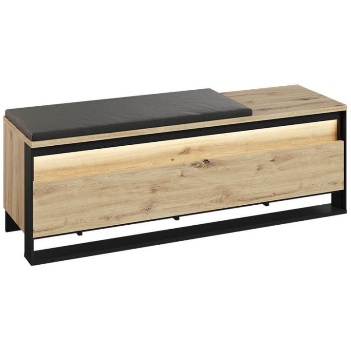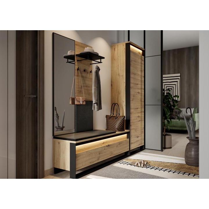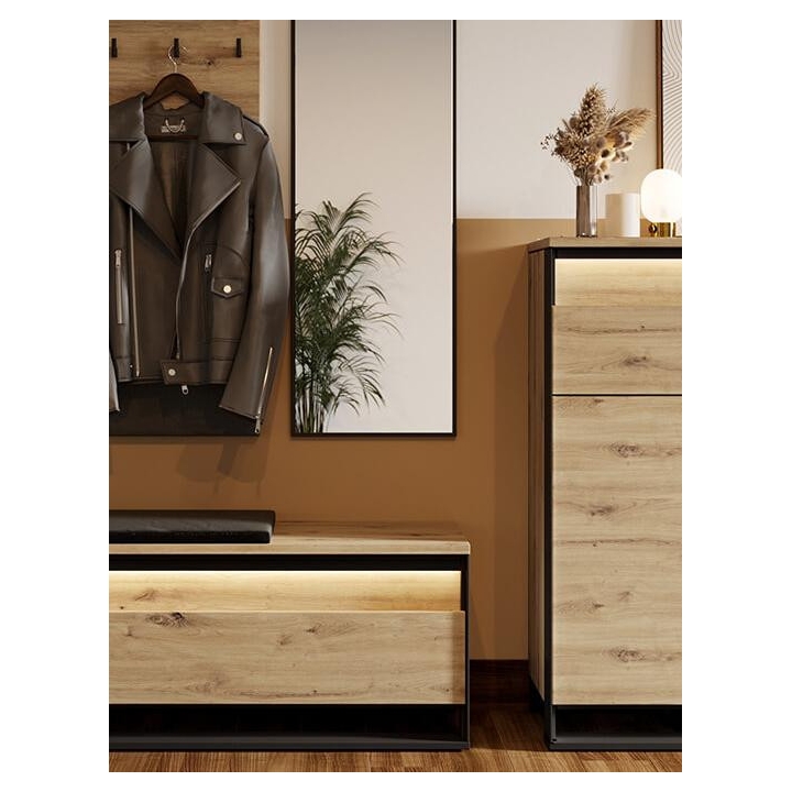 The loft-styleQuant seat shoe cabinet, in artisan oak and black, blends perfectly with the interior design. Measuring 135 cm wide, 49 cm high and 40 cm deep, the furniture requires simple assembly. Equipped with three capacious storage spaces, it provides convenient storage for shoes and other small items. The modern design is enriched by an interesting decor and a slender black support, emphasising the elegance of the furniture. LED lighting (available as part of the set) adds charm, giving the interior a moody atmosphere. Made of durable laminated board, the cabinet ensures not only aesthetics, but also durability.