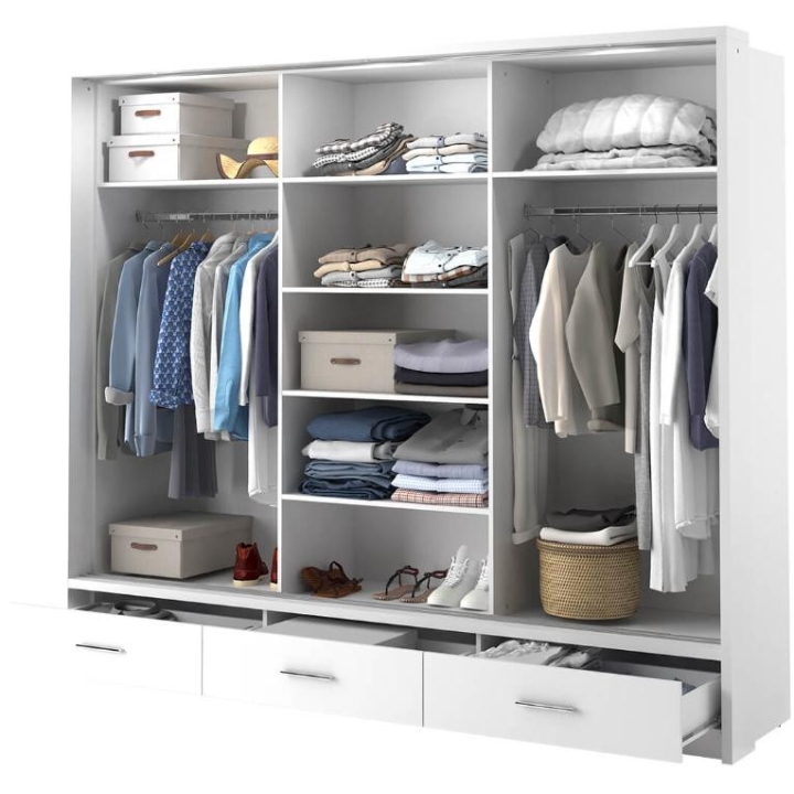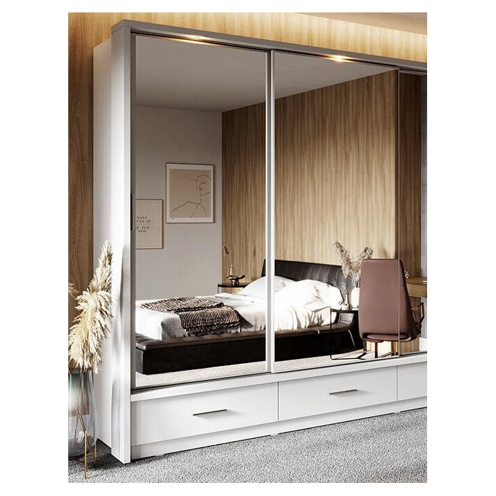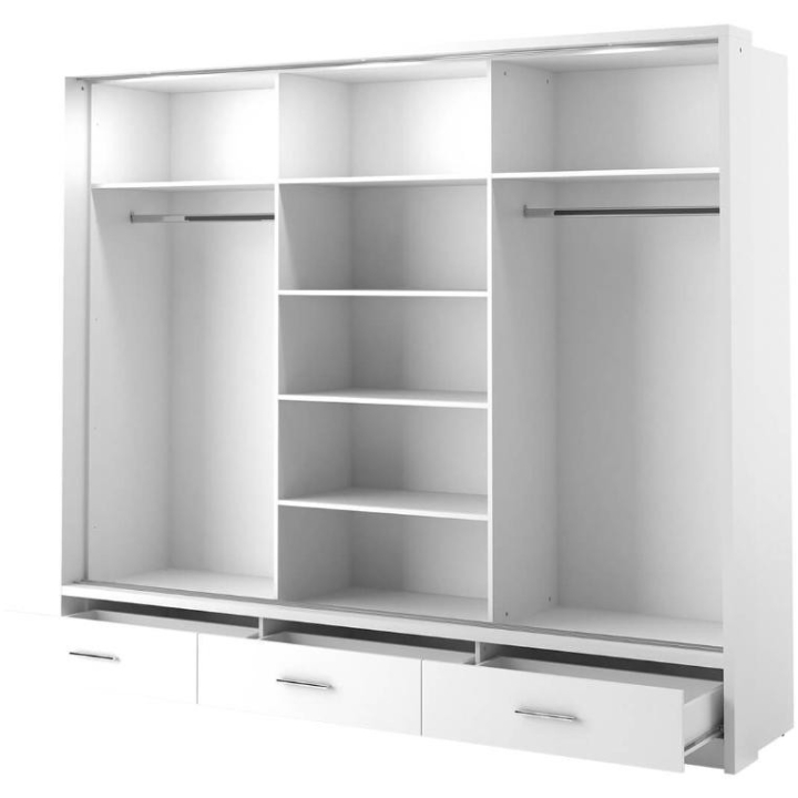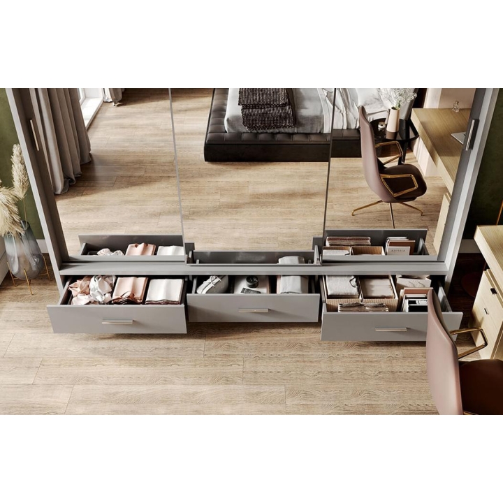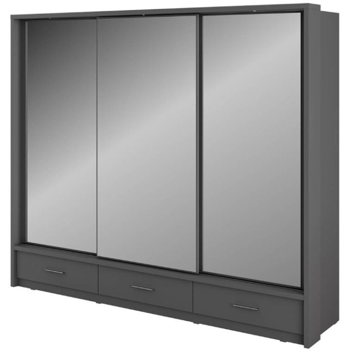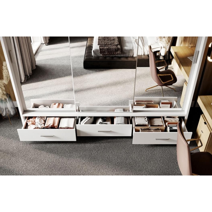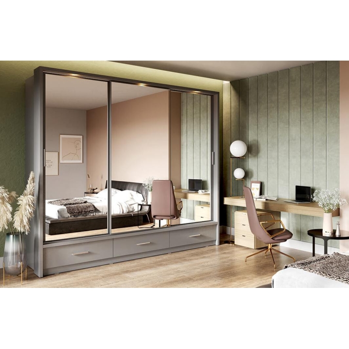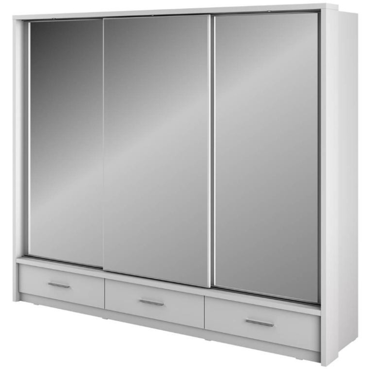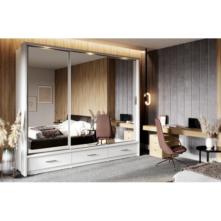 With a width of 250 cm, a height of 215 cm and a depth of 63 cm, the wardrobe is an ideal solution for a wardrobe, bedroom or hallway, perfectly matching the modern style of the interior. The furniture in white or grey is not only an elegant finish, but also functional and capacious. With three sliding doors, each covered with a large mirror, it becomes an essential element of every wardrobe. The furniture is equipped with LED lighting, which will provide a unique atmosphere to the room. Below the mirrors there are three easily accessible drawers, ideal for storing linen, accessories or other accessories. The interior of the wardrobe has been designed with maximum organisation in mind - you will find two clothes rails and several capacious shelves that you can adjust to your needs. An additional advantage is the lighting, which makes using the wardrobe even more comfortable. Made of durable laminated board, the piece of furniture ensures not only an aesthetically pleasing appearance, but also long-lasting usability. The wardrobe is available in 2 colours: white and grey.