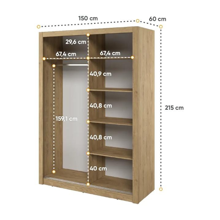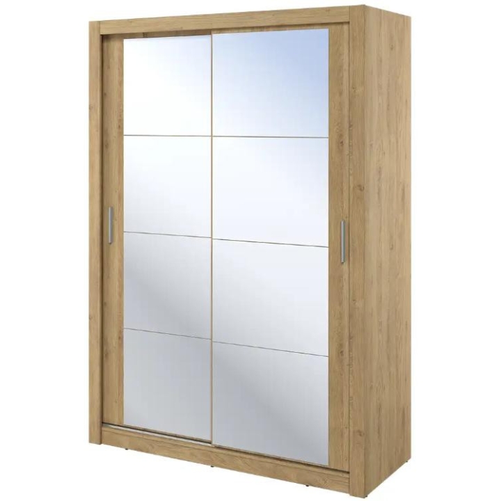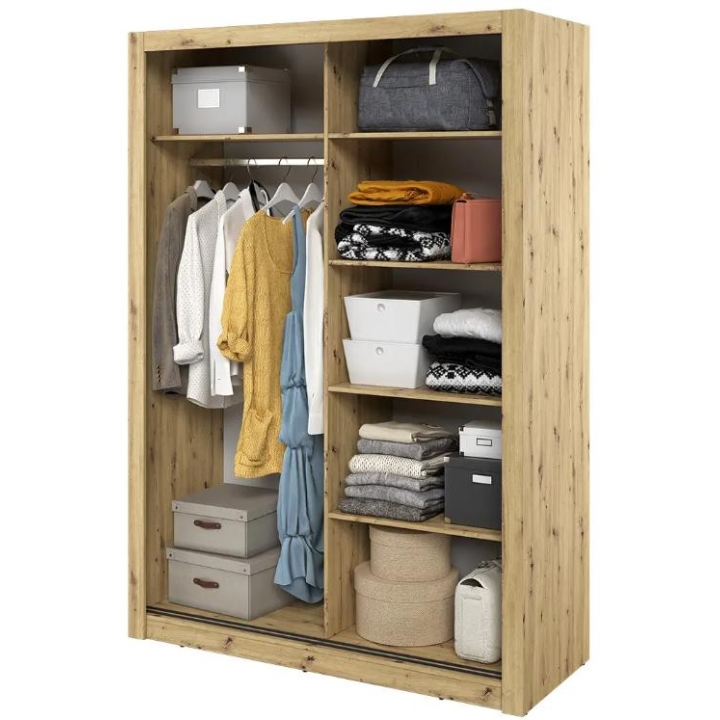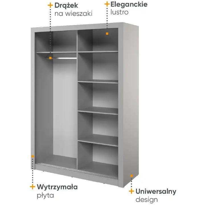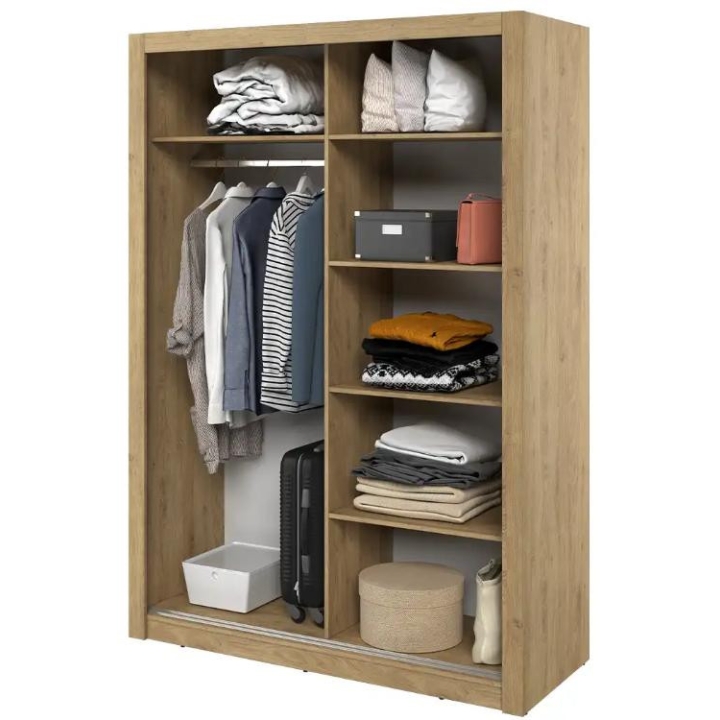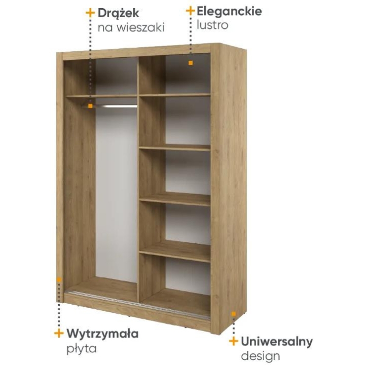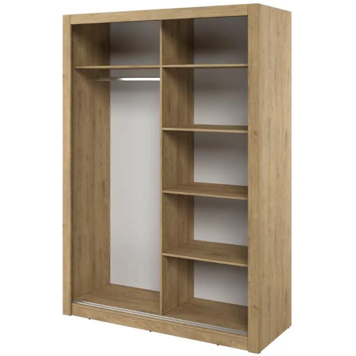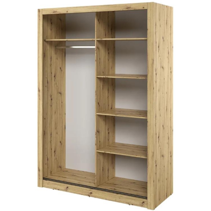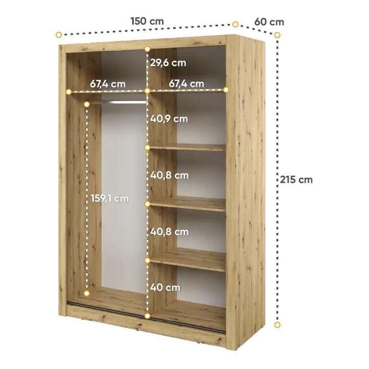 The elegant Arti wardrobe, is the perfect solution for your bedroom. The piece of furniture measures 150 cm wide, 215 cm high and 60 cm deep. Built with functionality and modern style in mind, this two-door wardrobe offers plenty of storage space. Its sliding doors make it easy to access the interior, while the mirrors on them add elegance and optically enlarge the space. Equipped with a bar and five shelves, it allows you to store clothes and accessories according to your needs. The furniture needs to be assembled, but thanks to the careful workmanship and high-quality materials, the wardrobe will last for many years. Find the perfect wardrobe for your bedroom today! The furniture is available in 4 colour options: shetland oak, artisan oak, white and grey.