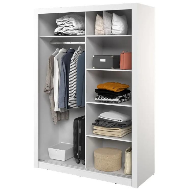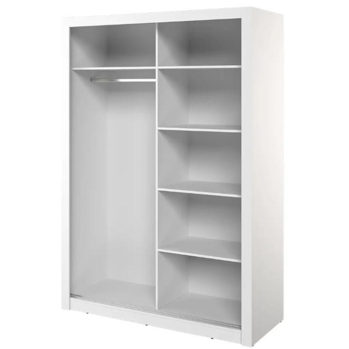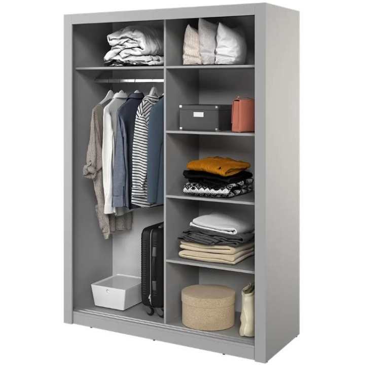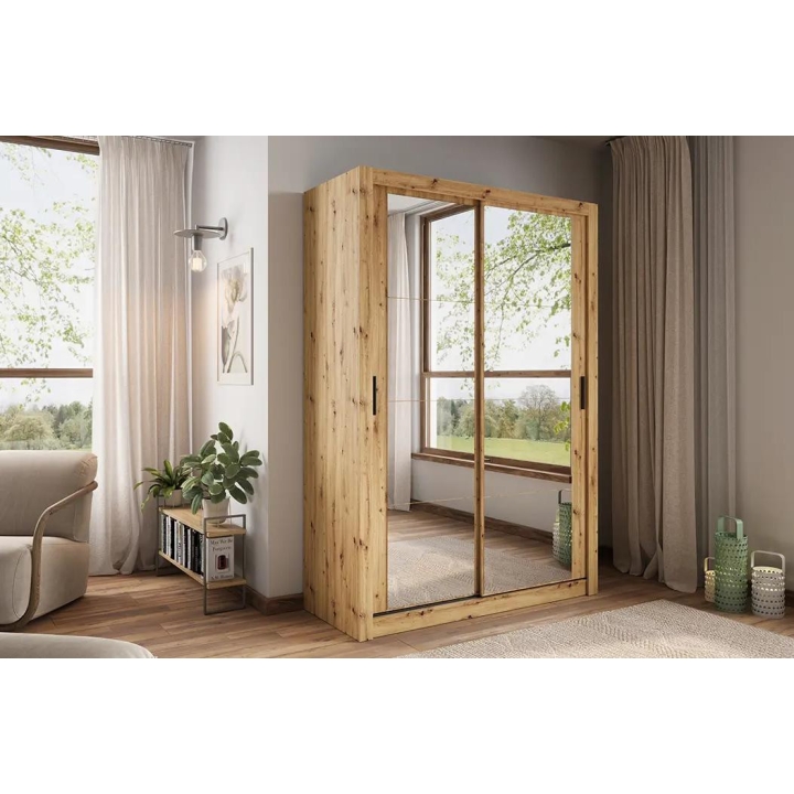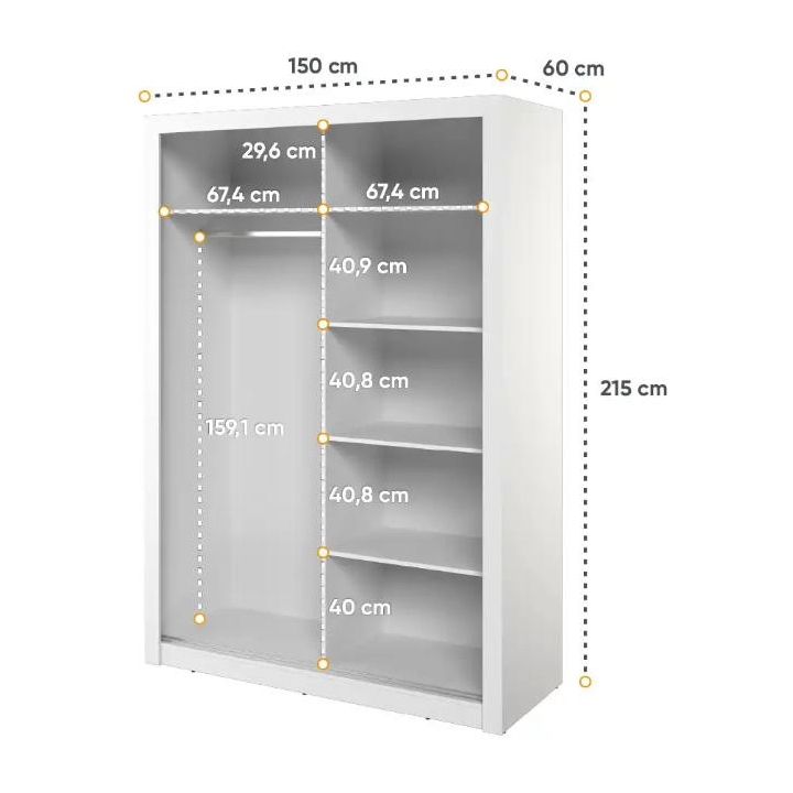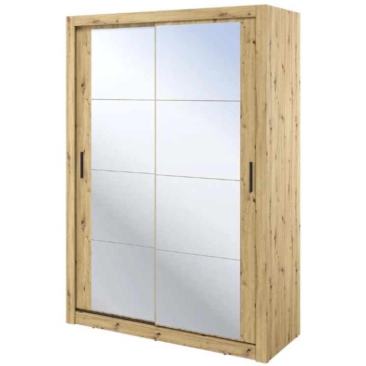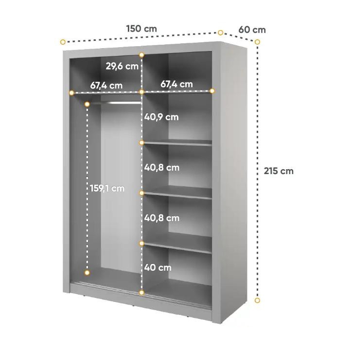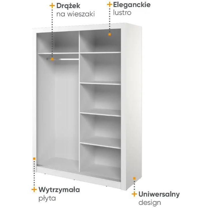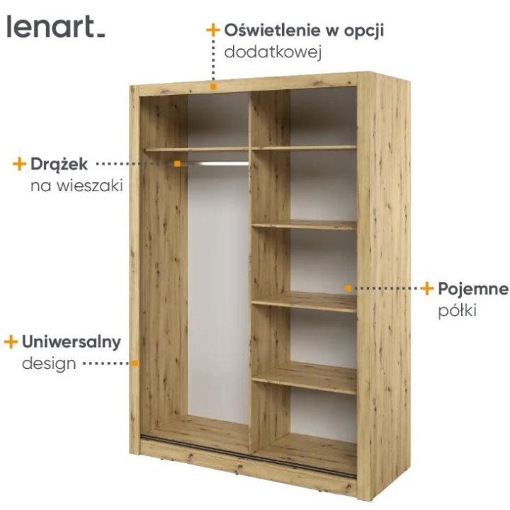 The elegant Arti wardrobe, is the perfect solution for your bedroom. The piece of furniture measures 150 cm wide, 215 cm high and 60 cm deep. Built with functionality and modern style in mind, this two-door wardrobe offers plenty of storage space. Its sliding doors make it easy to access the interior, while the mirrors on them add elegance and optically enlarge the space. Equipped with a bar and five shelves, it allows you to store clothes and accessories according to your needs. The furniture needs to be assembled, but thanks to the careful workmanship and high-quality materials, the wardrobe will last for many years. Find the perfect wardrobe for your bedroom today! The furniture is available in 4 colour options: shetland oak, artisan oak, white and grey.