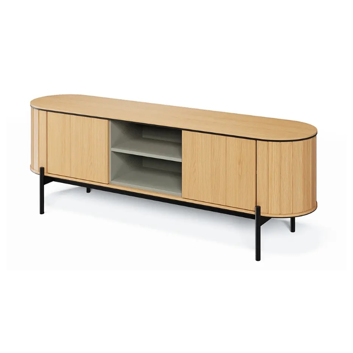 The 168 cm wideROTTO RTV cabinet is a smaller version of the modern cabinet, perfectly suited to spaces that require a subtle but stylish accent. Its characteristic rounded edges and straight lines create a harmonious whole that brings lightness and elegance to the interior. The colour scheme of Vicenza oak adds warmth to the furniture, while the black metal legs enhance themodern look and add visual lightness.