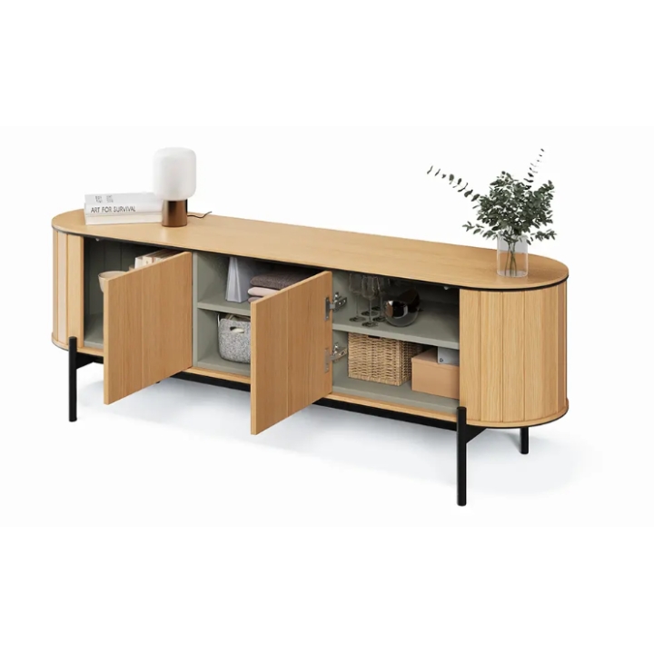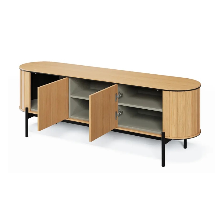 Made from laminated chipboard, the cabinet combines durability and high aesthetics. It has two doors and three shelves that provide adequate space for RTV equipment, books and accessories. The central open section allows electronic equipment to be placed comfortably, while maintaining the aesthetics of the entire piece of furniture.