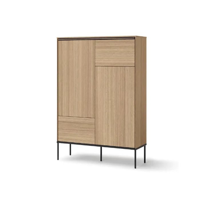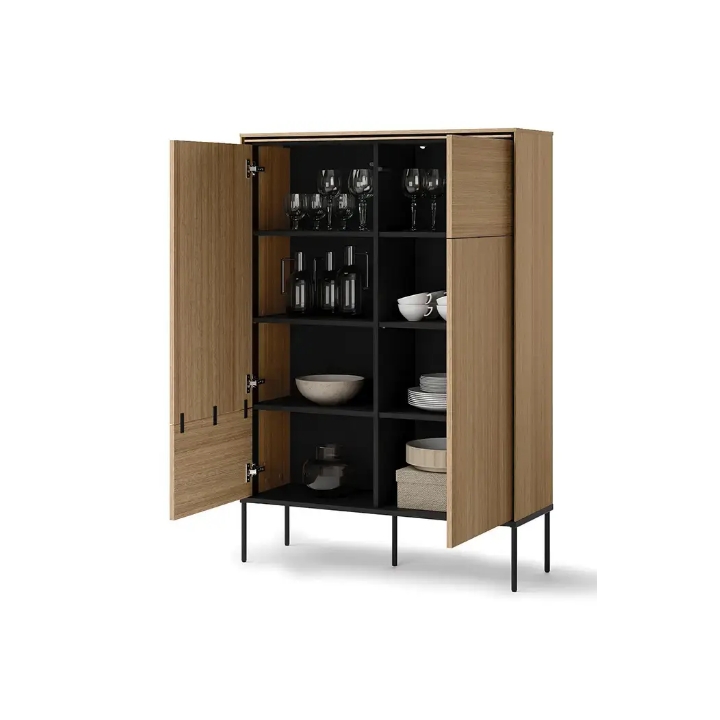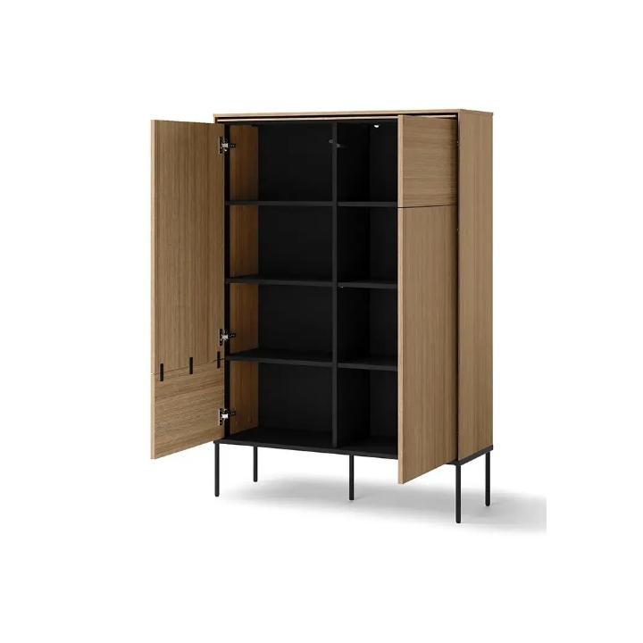 The furniture is distinguished by its precise workmanship and the colour of light linear oak, which catches the eye at first sight. The use of high-quality laminated chipboard and black metal legs ensures durability and stability of the structure. With its two-door design and six shelves , the chest of drawers offers a wide range of storage options. Thanks to its refined appearance and well-thought-out layout, the furniture fits perfectly into the needs of modern interiors.