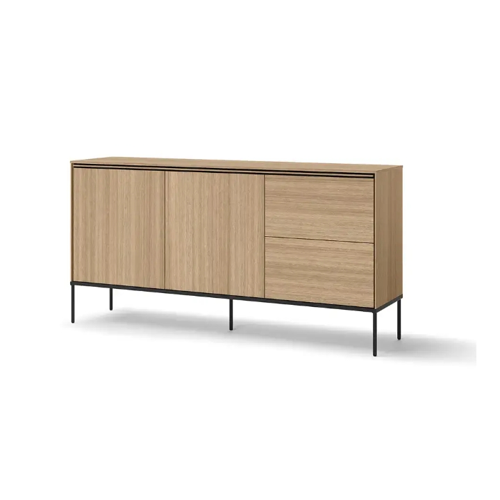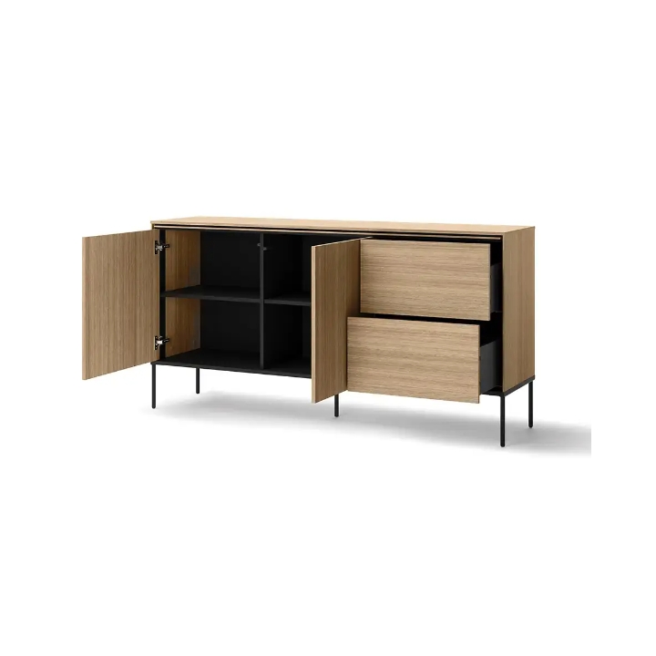 A characteristic element of this piece of furniture are the slender black metal legs, which bring a modern touch to the chest of drawers, creating a contrast with the massive body. This kind of minimalist form adds an original touch to the interior without overwhelming the space. Thanks to this design, the chest of drawers becomes an excellent choice for modern arrangements, emphasising their unique style.