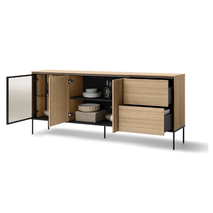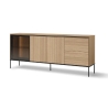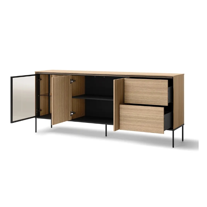 The VI-06 chest of drawers from the VISSO collection by Lenart is a modern piece of furniture that fits perfectly into a living space. Made of laminated chipboard, it offers a unique harmony of form and usability. With dimensions of 201 cm wide, 85 cm high and 41 cm deep, it provides ample storage space, while its subtle colour scheme in the shade of linear oak with black ribbon, combined with dark glass and lighting, brings warmth and naturalness to the interior. The chest of drawers is equipped with metal, high black legs, which adds to its solidity and character.