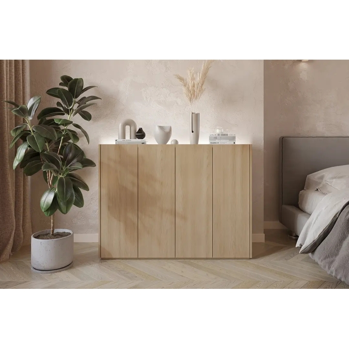The EA-02 chest of drawers from the EASY collection from the manufacturer Lenart is a modern piece of furniture in oak scandi/white gloss, perfect as a chest of drawers for a vestibule. With dimensions of 126 cm wide, 95 cm high and 40 cm deep, the chest of drawers provides space for storing shoes, accessories or clothes. Equipped with four doors and four shelves, it allows for convenient organisation, while the A++ energy class LED lighting enhances its modern look. Soft close canned hinges ensure the doors close quietly for added comfort.