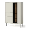 The furniture measures 99 cm wide, 140 cm high and 41 cm deep. The chest of drawers has a 3-door construction and is equipped with 1 drawer. It has metal black legs and its drawer is fitted with push-open slides for easy opening. The doors, mounted on canned hinges, ensure quiet and effortless operation.