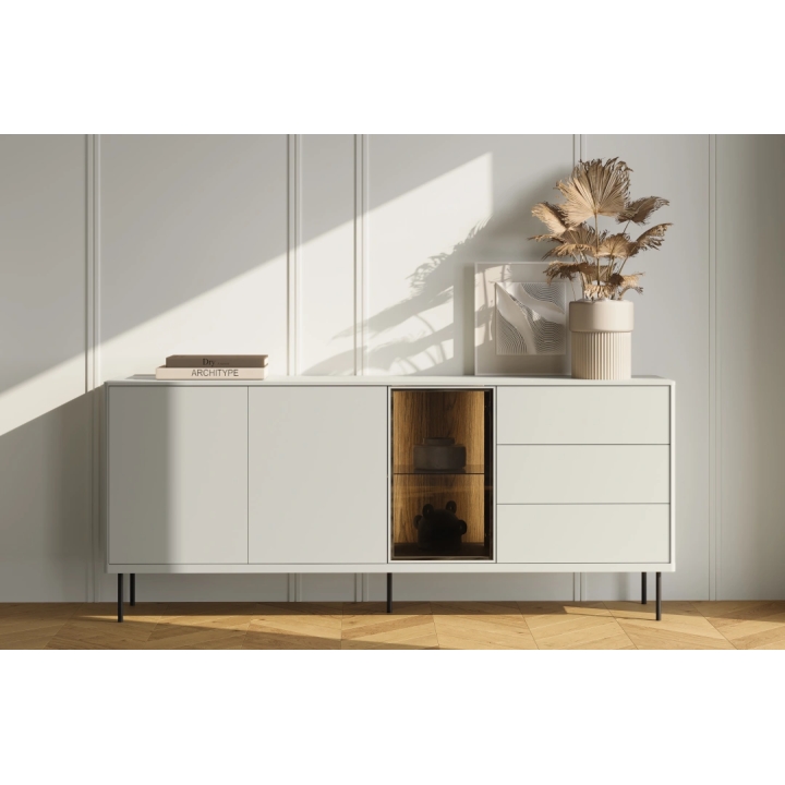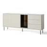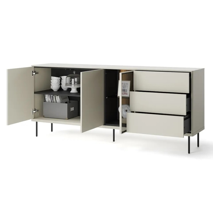 The metal legs in black add contrast to the whole, emphasising the modern design of the furniture. The Epiro chest of drawers is perfect as a piece of living room furniture, offering spaciousness and aesthetic details. Thanks to its well-thought-out design, the Epiro chest of drawers fits perfectly into modern interior arrangements. Its minimalist form, combined with practical features and high-quality materials, makes it a piece of furniture worthy of consideration for those looking for solutions for their living room.