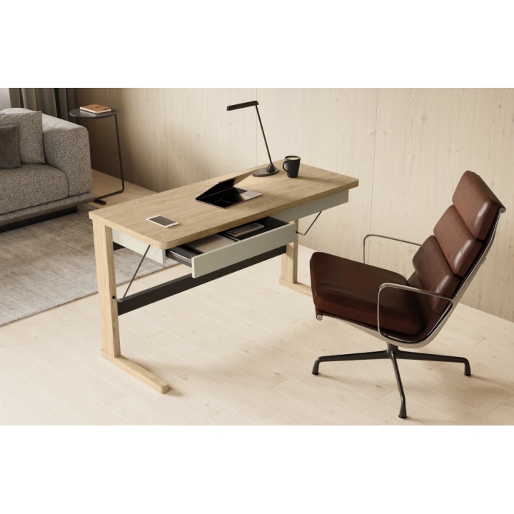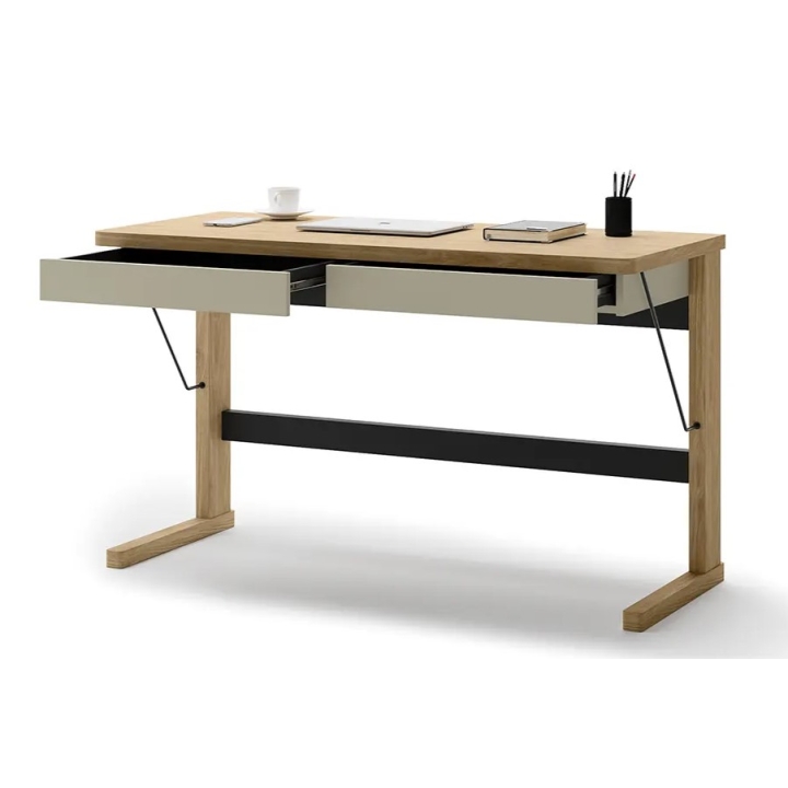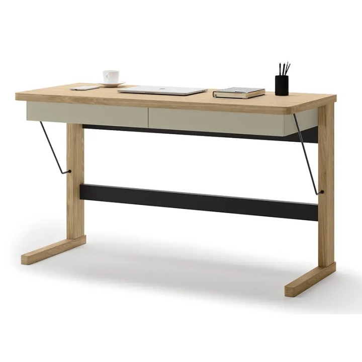 The furniture is distinguished by its simple but modern colour scheme. It is made in oiled oak tones, with a cashmere-coloured front. The entire piece has been carefully finished, which emphasises its high quality and attention to detail. The desk fits perfectly into contemporary interiors, bringing a natural elegance to them.