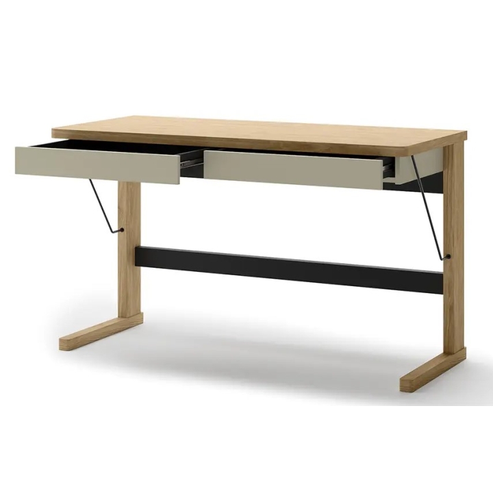 The dimensions of the desk are 131 cm wide, 77 cm high and 56 cm deep. It features two drawers, the inside of which is finished with a black ribbon and the bottom of the drawers is made of 3 mm thick HDF. The construction of the desk is based on 16 mm thick laminated chipboard and 32 mm thick for the top, which ensures durability for many years. In addition, ABS edge finishing guarantees resistance to mechanical damage and an aesthetic appearance.