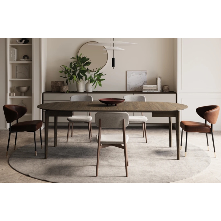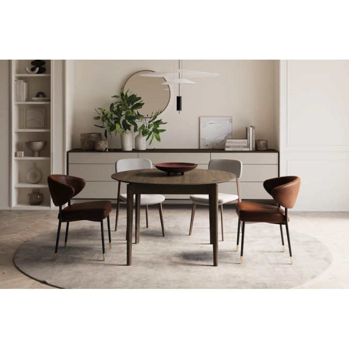 The extendingtable top has a synchronous slide and three inserts measuring 40x120 cm, which quickly expand the usable space. The table on wooden legs looks great in both smaller and larger interiors. The round shape of the tabletop is conducive to conversations and shared meals, ensuring that all users have equal access to the table space.