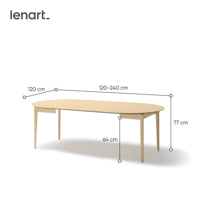 The extendingtable top is made of 22 mm thick laminated chipboard, finished with ABS edging, which increases resistance to daily use. A synchronous slide and three inserts measuring 40x120 cm allow the table top to quickly increase its surface area. The table with wooden legs is stable and its universal colour scheme in light oak matches Scandinavian, modern or classic style interiors.
