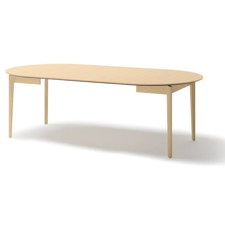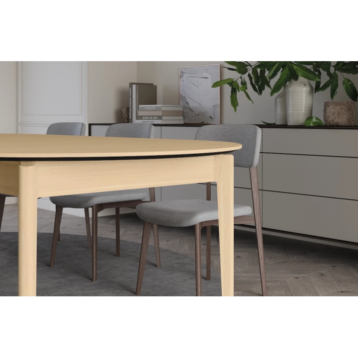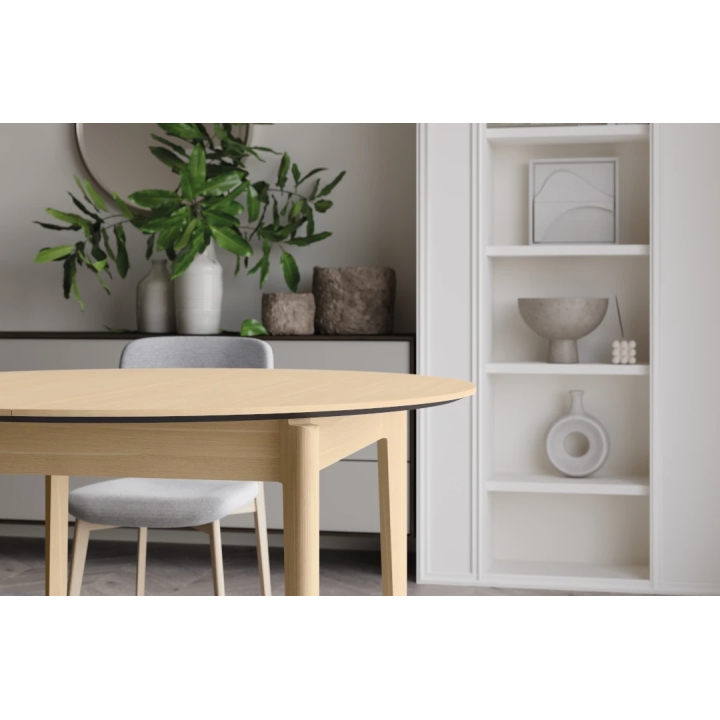 Thelight oak folding dining table combines solidity of workmanship and comfort of use. The light colour optically enlarges the space and goes well with light-coloured accessories. This is a great option for those looking for a table for everyday use and for special occasions.