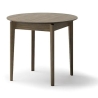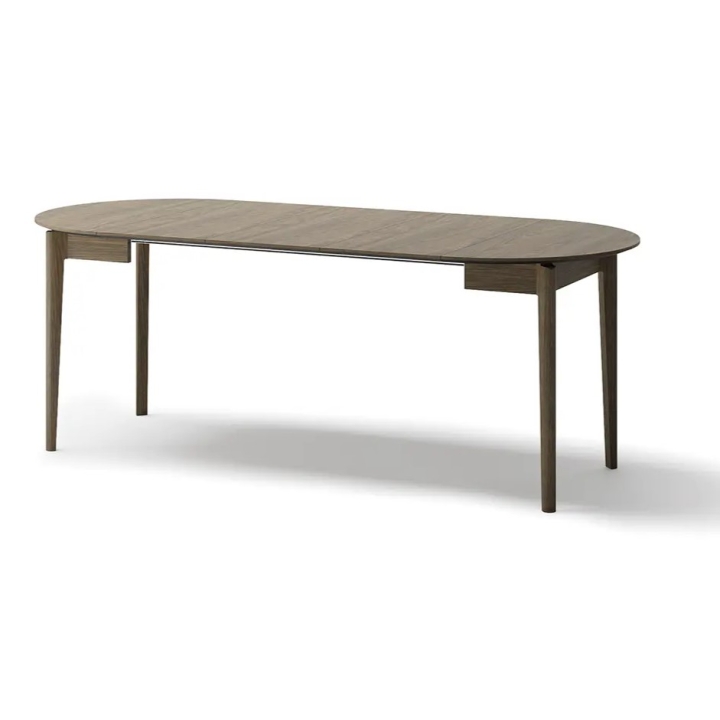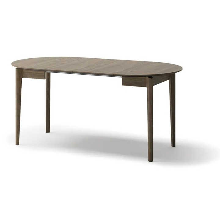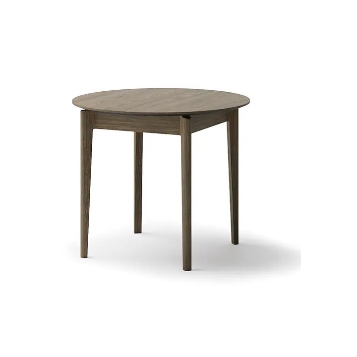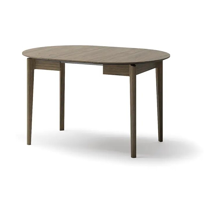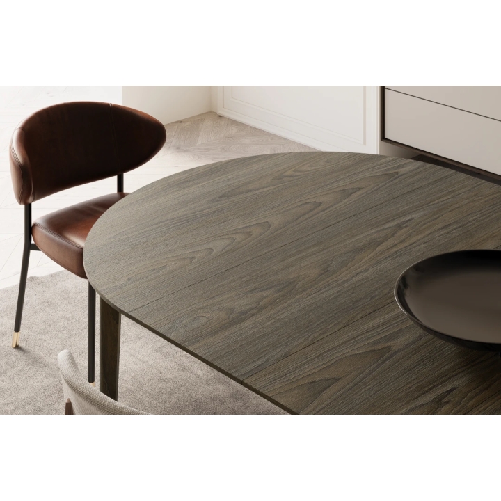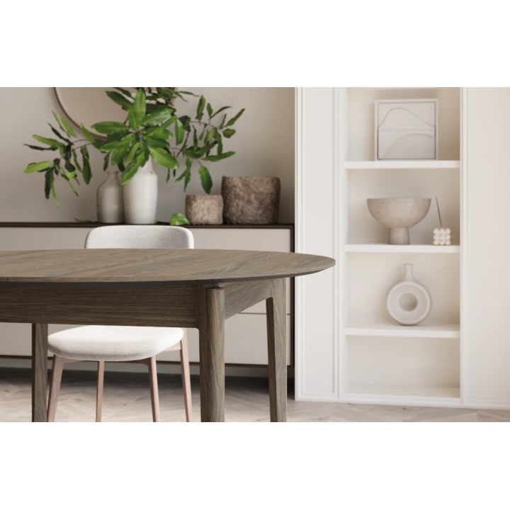 The extending dining table in dark oak is the perfect solution for smaller rooms, which gain additional space when needed. The round form is conducive to conversation and integration, and the dark colouring goes well with light and contrasting accessories. It is a solid piece of furniture that will work well for everyday use and family gatherings.
