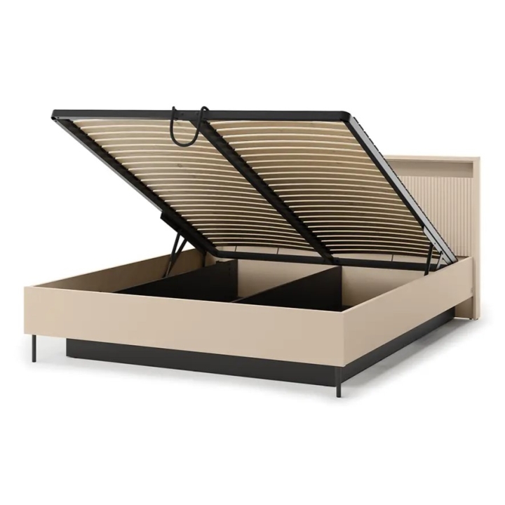 The model is equipped with a 160 x 200 cm metal frame with sprung slats, which guarantees durability and proper support during sleep. The bed should be matched with a bonell or foam mattress 160/200 and 18 cm high - the mattress is not included in the set. The integrated bedding container, accessible by lifting the frame, enables you to store your daily textiles in an orderly manner and keep your bedroom tidy.