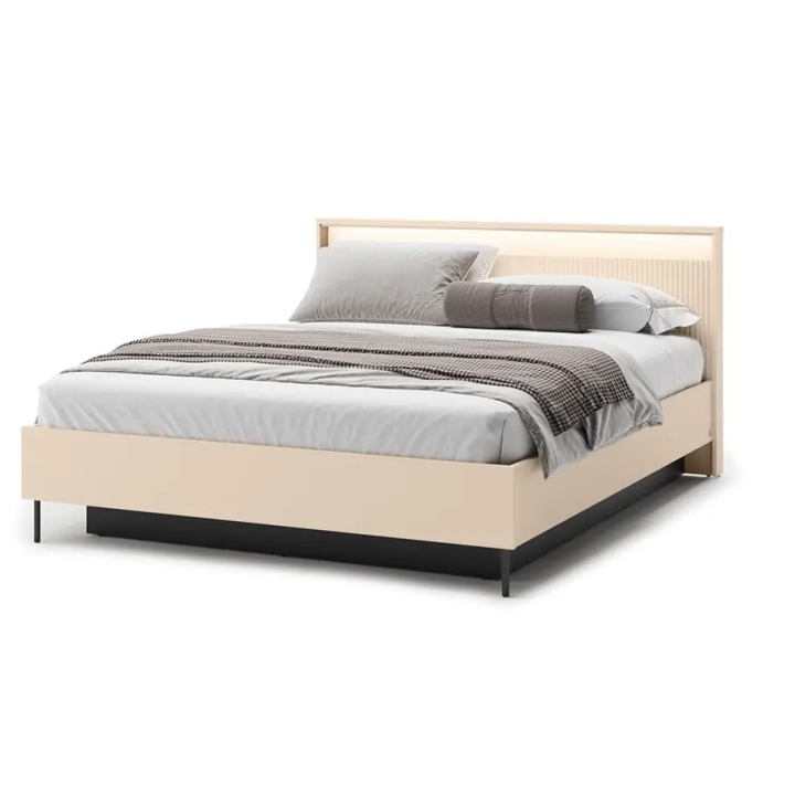 The juxtaposition of sand beige with accents of black gives the whole a calm and balanced character. The grooved headrest comes to the fore, whose delicate texture brings a touch of depth and structural differentiation to the interior. The structure is made of laminated chipboard, protected by ABS edging, and its stability is supported by glides at the base.