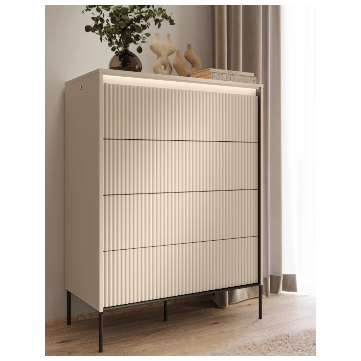The top of the chest of drawers is fitted with LED lighting in the form of an under-counter panel, which creates a subtle lighting effect that is particularly visible in the evening. Thanks to it, the grooved texture of the fronts becomes more pronounced and draws attention to the play of light and shadow. This solution gives the furniture a modern character and contributes to a relaxed atmosphere in the interior design.