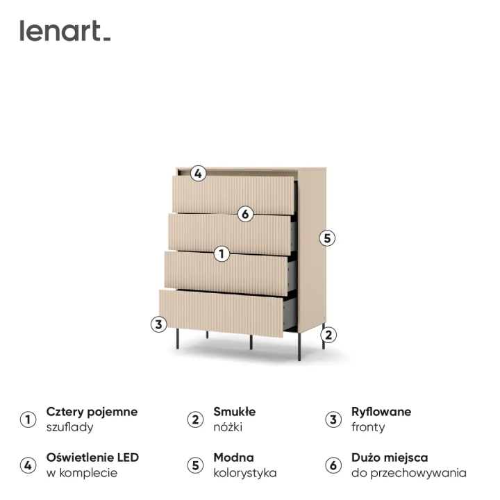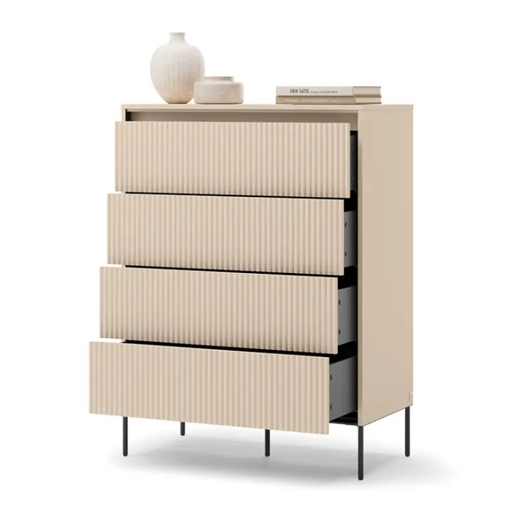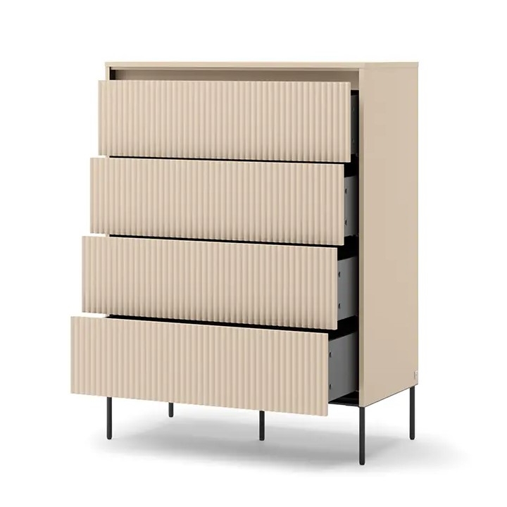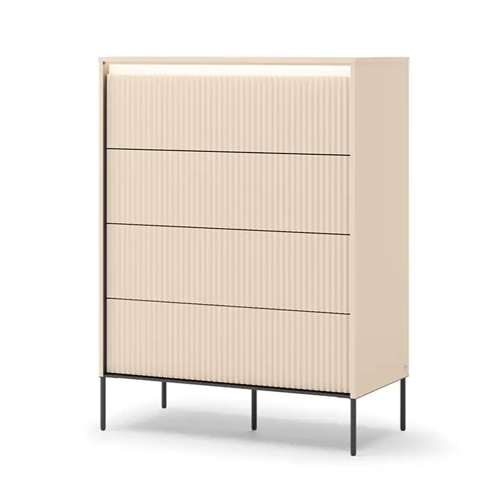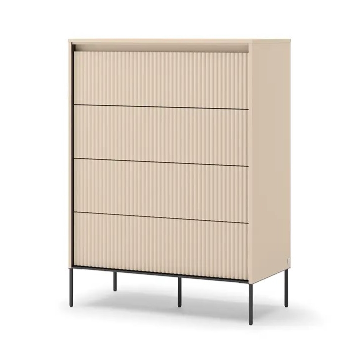 The TS-04 chest of draw ers from the Trend collection by Lenart draws attention to the juxtaposition of sandy beige surfaces with black details, which gives it a distinctive look without too much contrast. With a width of 93 cm, a height of 125 cm and a depth of 47 cm, it is a piece of furniture that will work well in both more intimate and spacious rooms. The vertically fluted fronts are a characteristic element of the Trend collection, introducing a depth effect.
