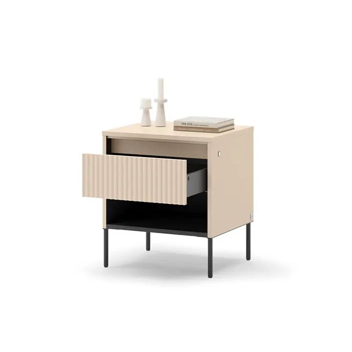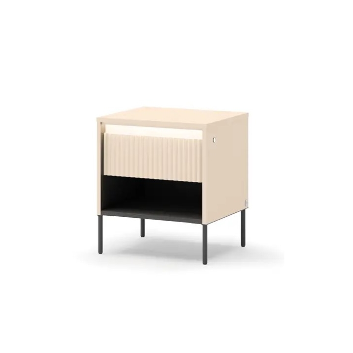 The solid has been equipped with one drawer and an open niche, which will be perfect as a place for a book, charger or other items kept close to the bed. The front is made of MDF with decorative grooving, while the body and top are laminated board with ABS edging. The bottom of the drawer is made of HDF, and the bottom-mounted runner with push-to-open system allows for convenient opening without handles.