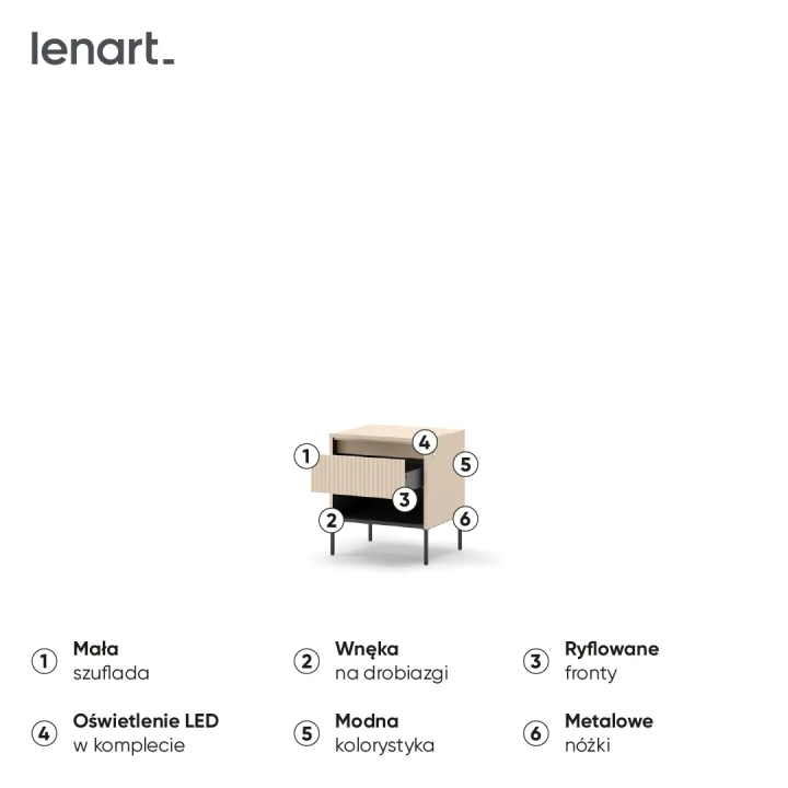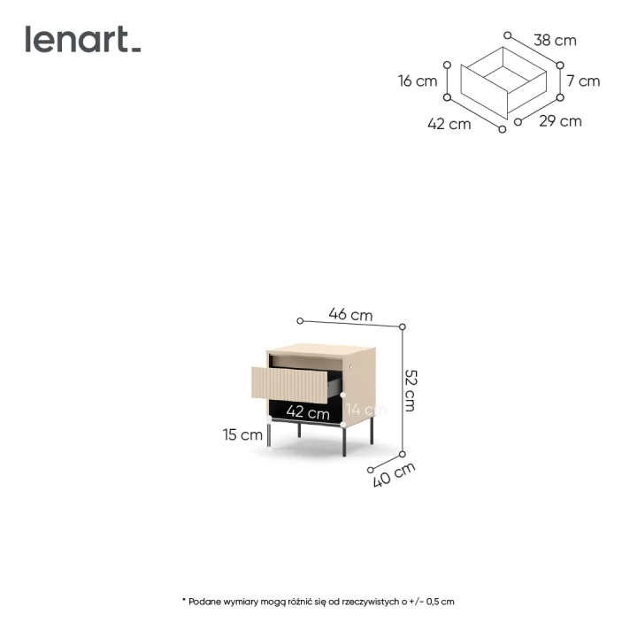 The TS-10 bedside cabinet from the Trend collection by Lenart is a proposal that brings modern simplicity in a refined form to the interior. It has been designed in the colour scheme of piscine beige with black accents. The design is 46 cm wide, 52 cm high and 40 cm deep. Elevating the solid on high black legs not only adds visual lightness, but also makes it easier to keep the furniture clean underneath.