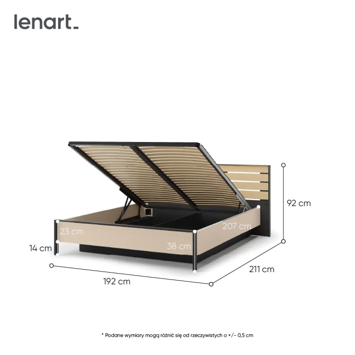 The 192 cm wide, 211 cm deep and 92 cm high body is made of 16 and 22 mm thick laminated board, with ABS edge trim. The frame and tops of the bed have also been made from laminated chipboard and MDF strips, which translates into a solid construction. A bedding container is an element that supports daily use, which is ideal when space is limited. The frame with sprung slats and a metal frame ensures durability and stability.