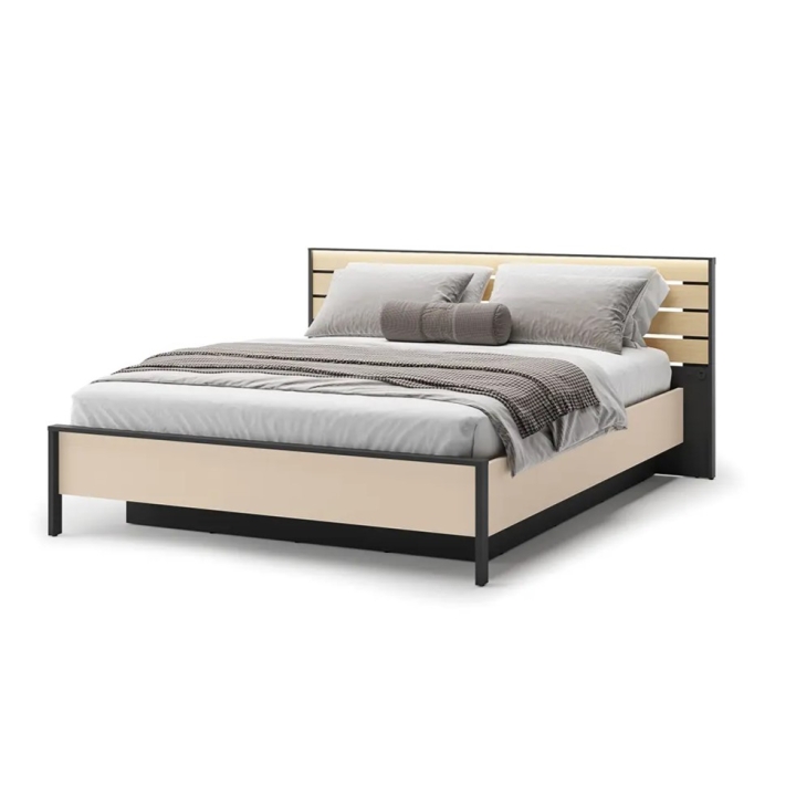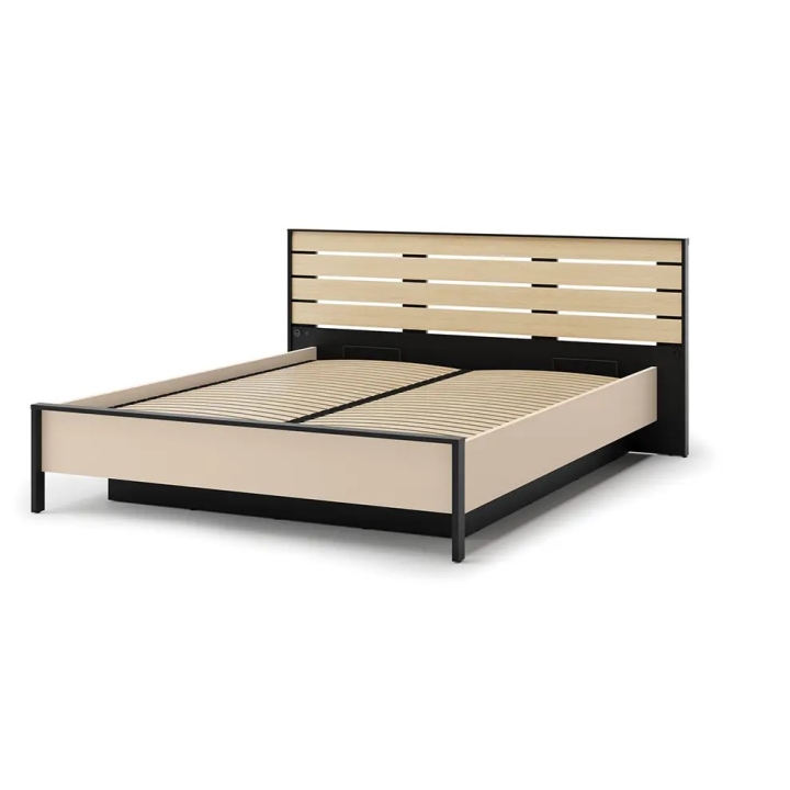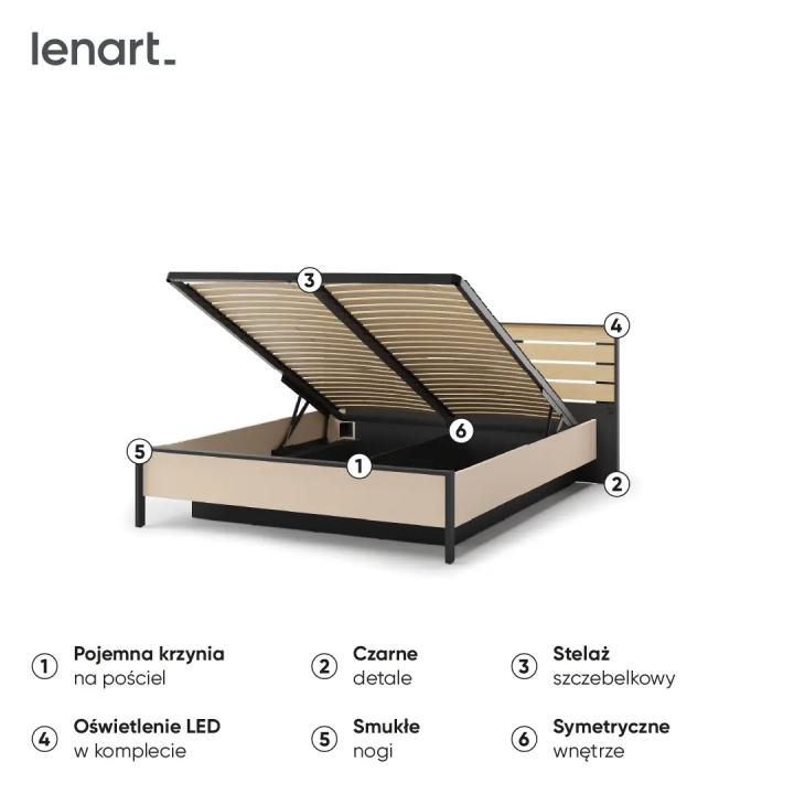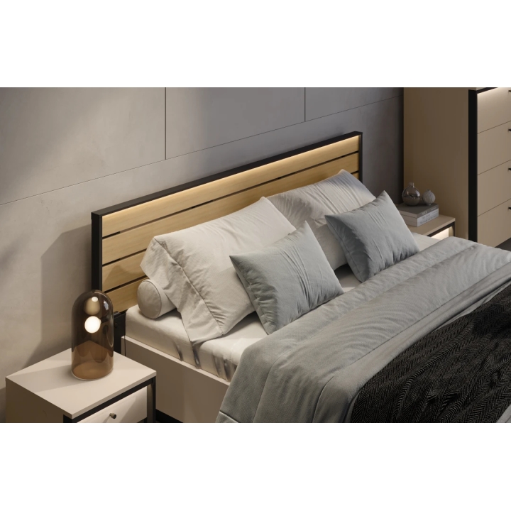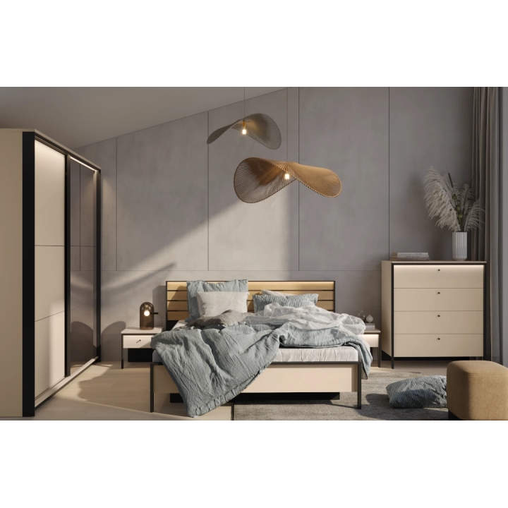 The EN-02 (160) bed from the Enna collection from the manufacturer Lenart has been designed to provide a full-fledged rest. The construction is based on black, slender legs which add lightness to the whole unit. The whole is maintained in a balanced colour palette - a combination of beige, black and vincenza oak, which makes this model a strong accent in the bedroom space.