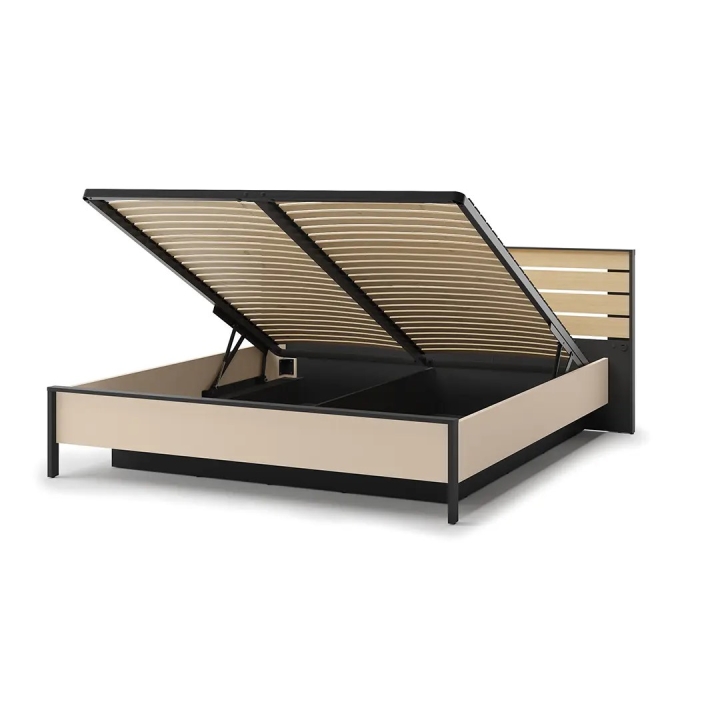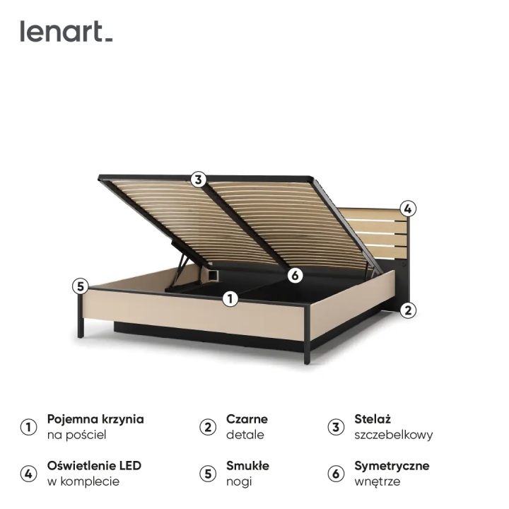 The EN-02 (180) bed from the Enna collection from the manufacturer Lenart has been designed to provide a wholesome rest. The bed floats on slender black legs, which add lightness to the entire body. The whole is maintained in a balanced colour palette - a combination of beige, black and vincenza oak, which makes this model a strong accent in the bedroom space.