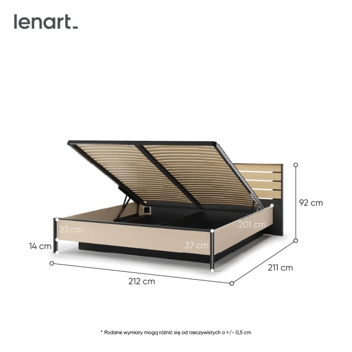 The 212 cm wide, 211 cm deep and 92 cm high body has been made from laminated board, with ABS edging finishing the edges. The frame and tops of the bed are also made of laminated chipboard and MDF strips, which translates into a solid construction. A bedding container is an element which supports daily use, which is ideal when space is limited.