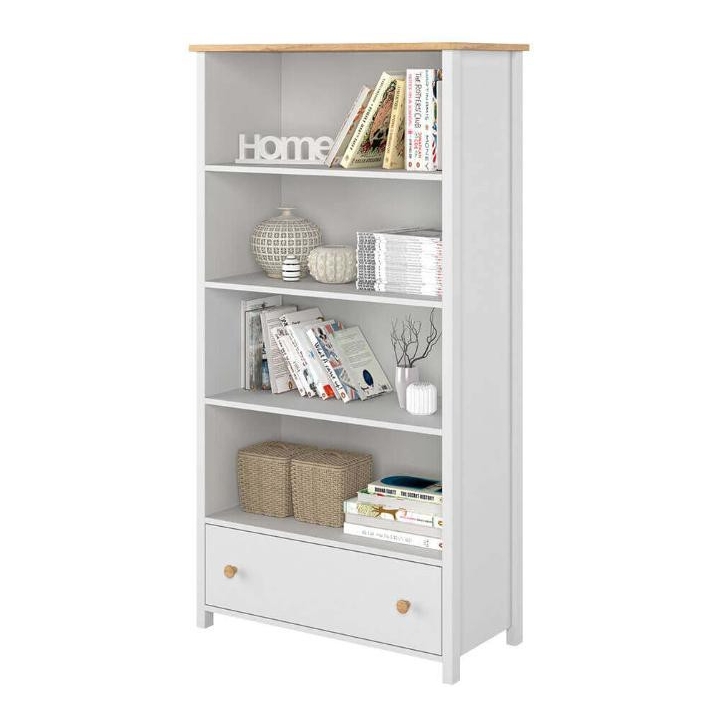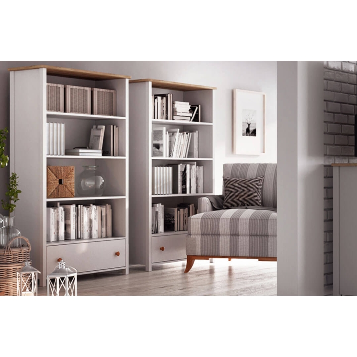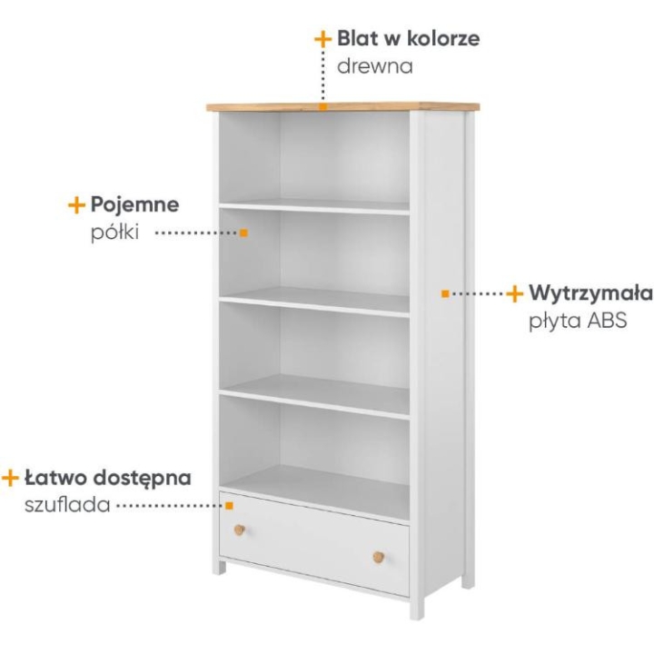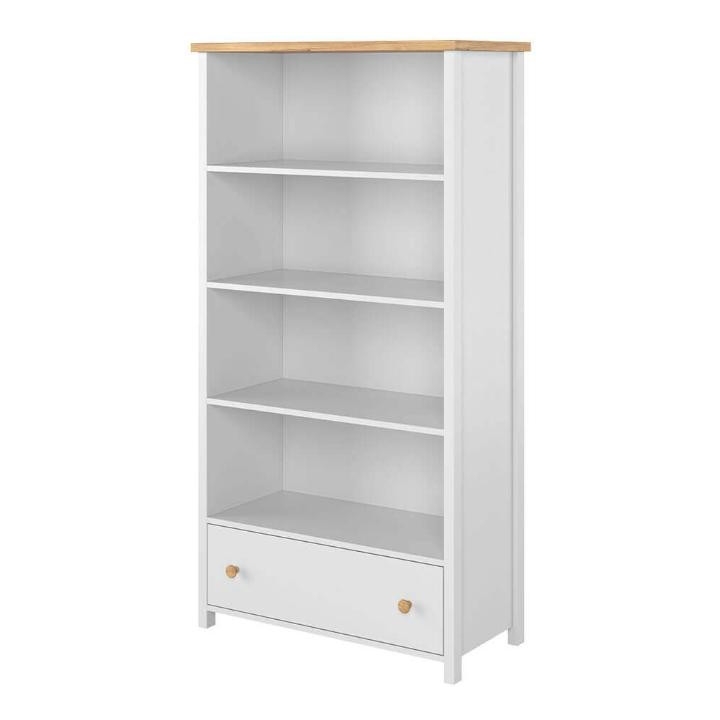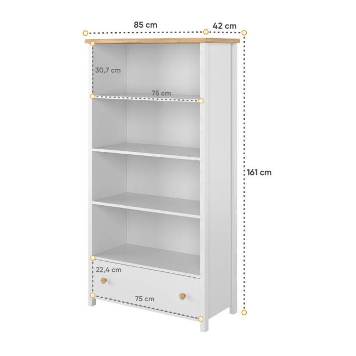 The stylish Story bookcase is an essential piece for any modern interior, fitting perfectly in a youth room, bedroom or living room. The bookcase measures 85 cm wide, 161 cm high and 42 cm deep. The juxtaposition of elegant white with the warm colour of Nash oak wood gives the furniture an original character, referring to the subtlety of the Provencal style. The deep shelves of the book case make it possible to display books, teaching aids and favourite decorations, which perfectly organises the space and gives the room a cosy character. In addition, the capacious drawer at the bottom of the bookcase provides easy access to stored items, also accessible to children's hands. Made from sturdy laminated board with durable ABS edging and plastic handles, the bookcase ensures robustness and durability. The furniture needs to be assembled, however this is an easy task to complete. The end result is a stylish and practical bookcase that will perfectly complement any interior, adding elegance and functionality.