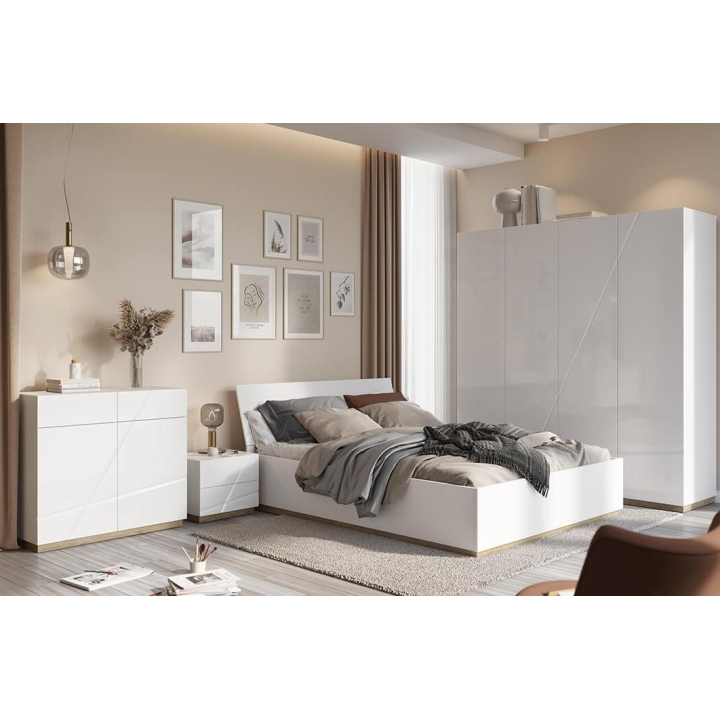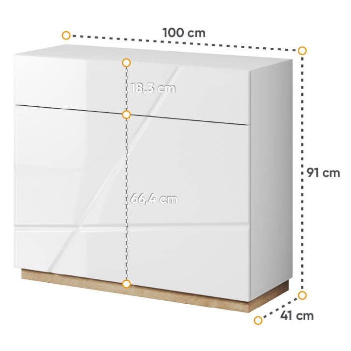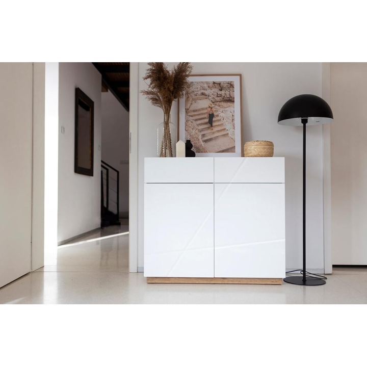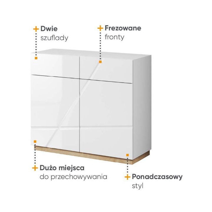 The Futura chest of drawers is a practical and stylish solution for a modern bedroom, characterised by its elegant white gloss colour and oak riviera decor. The furniture measures 100 cm wide, 91 cm high and 41 cm deep. The chest of drawers has been designed with functionality in mind, with two capacious drawers and two spacious shelves, ideal for storing linen, clothes or other small items. Its modern design is distinguished by the original milling of geometric lines on the white fronts, which blend harmoniously with the decorative finish of the furniture. Assembly of the chest of drawers is simple and quick. It is an ideal solution both for the bedroom and for other rooms such as the living room or hallway, adding elegance and practicality to the entire space.