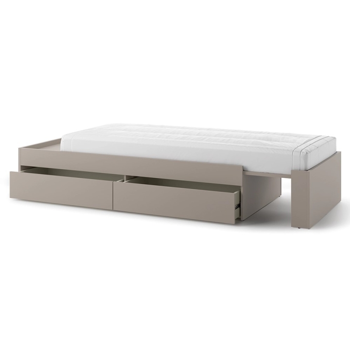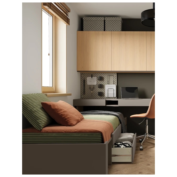 The model is equipped with two capacious drawers for easy storage of bedding, textiles and other essentials. What's more, the bed structure can be partially pulled out to create a temporary space, for example for the insertion of a desk. This solution is particularly useful in small rooms, where intelligent management of available space is important. The furniture in this collection can be put together in a variety of ways, making it possible to freely adapt the entire structure to the dimensions and character of the room.