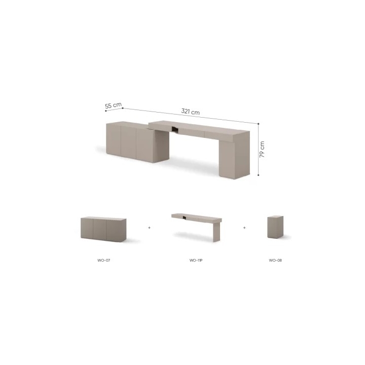 The SET-WOS6P desk is an elaborate composition that creates a coherent and comfortable space for study and daily leisure. The entire set measures 321 cm wide, 79 cm high and 55 cm deep, offering an impressive amount of space while maintaining a compact shape. Maintained in the shade of clay grey, the set fits perfectly in contemporary settings, giving the interior a balanced, calm character.